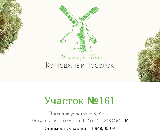 Мы позаботились, чтобы у будущих жителей нашего посёлка было всё для комфортной жизни. В коттеджном посёлке «Мельница Парк» располагается 160 участков, каждый — площадью от 10 соток и более. Жители посёлка смогут наслаждаться чистым воздухом, гулять в собственном парке и по экологическим тропам соснового леса, собирать грибы и ягоды.