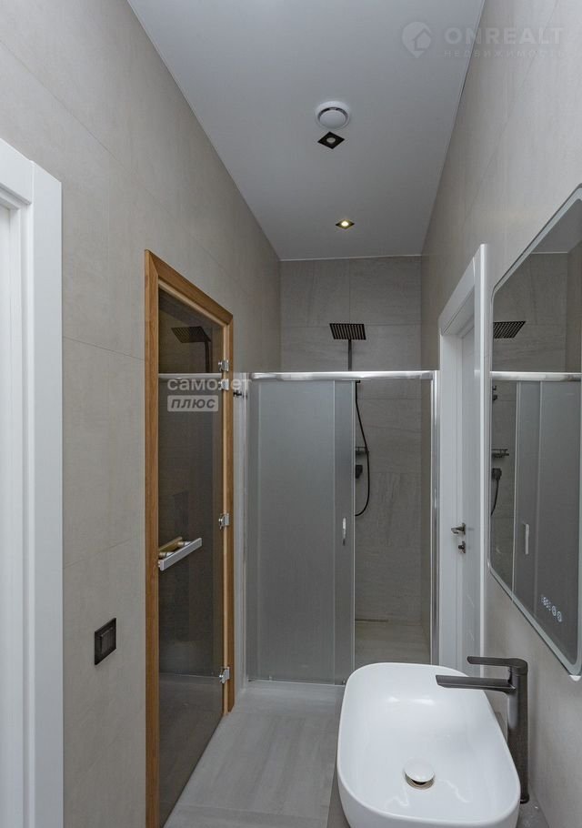 Основание дома - плита 300 мм. Стены монолитные с армированием 150 мм, с наружным утеплением, облицовка плитами «техноблок», отмостка утеплена. Большая терраса 43 кв. м. из лиственницы.