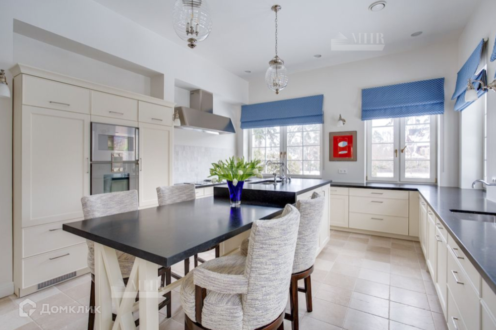 Мебель на кухне - Rod Punkt со столешницей из матового гранита, подвесные светильники - Summer Hill, бра - Urban Archeology. Для текстильных штор, декоративных подушек, подобраны ткани от Lee Jofa и Robert Allen, которые идеально сочетаются с предметами декора и картинами Петра Бронфина.