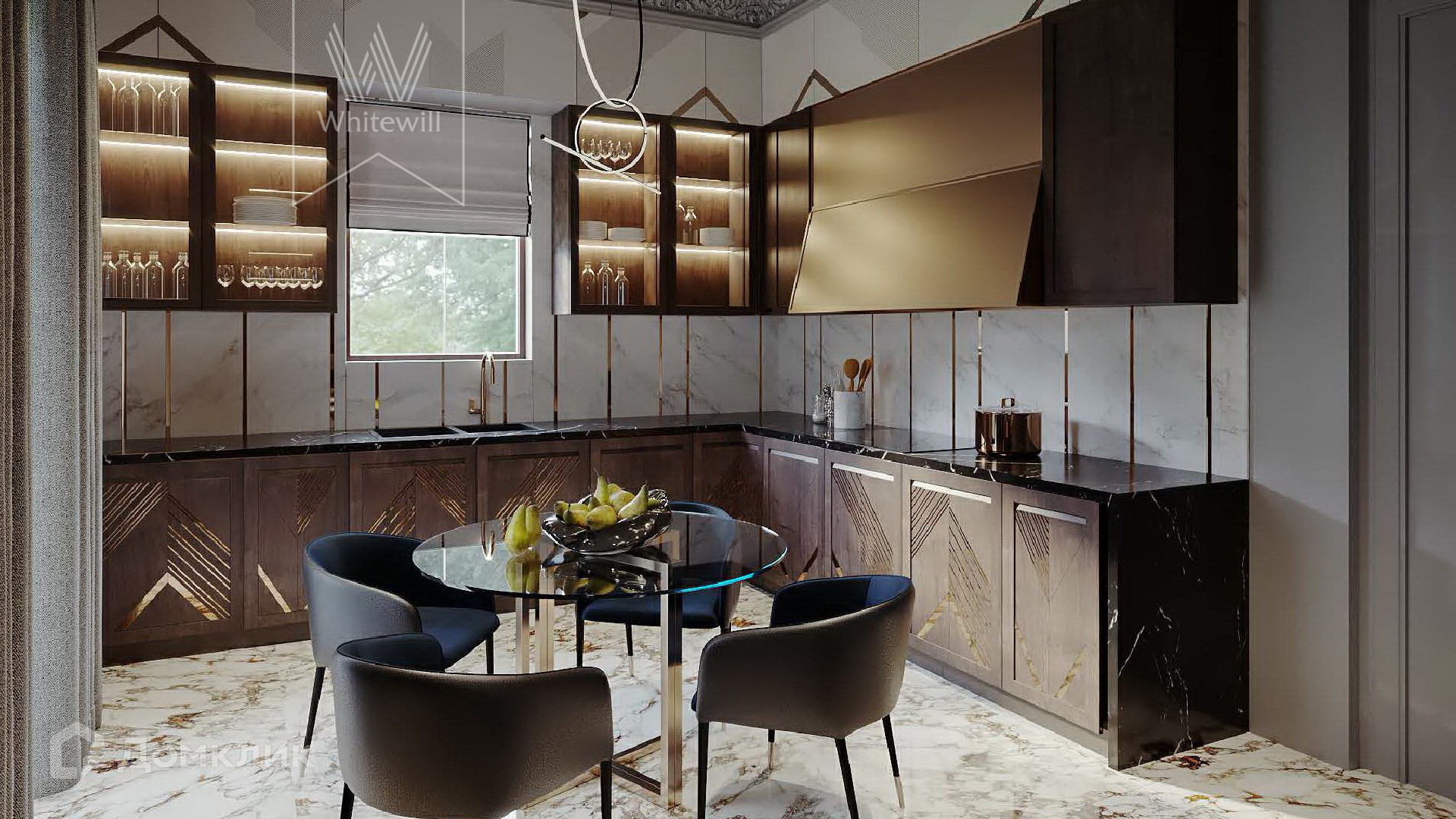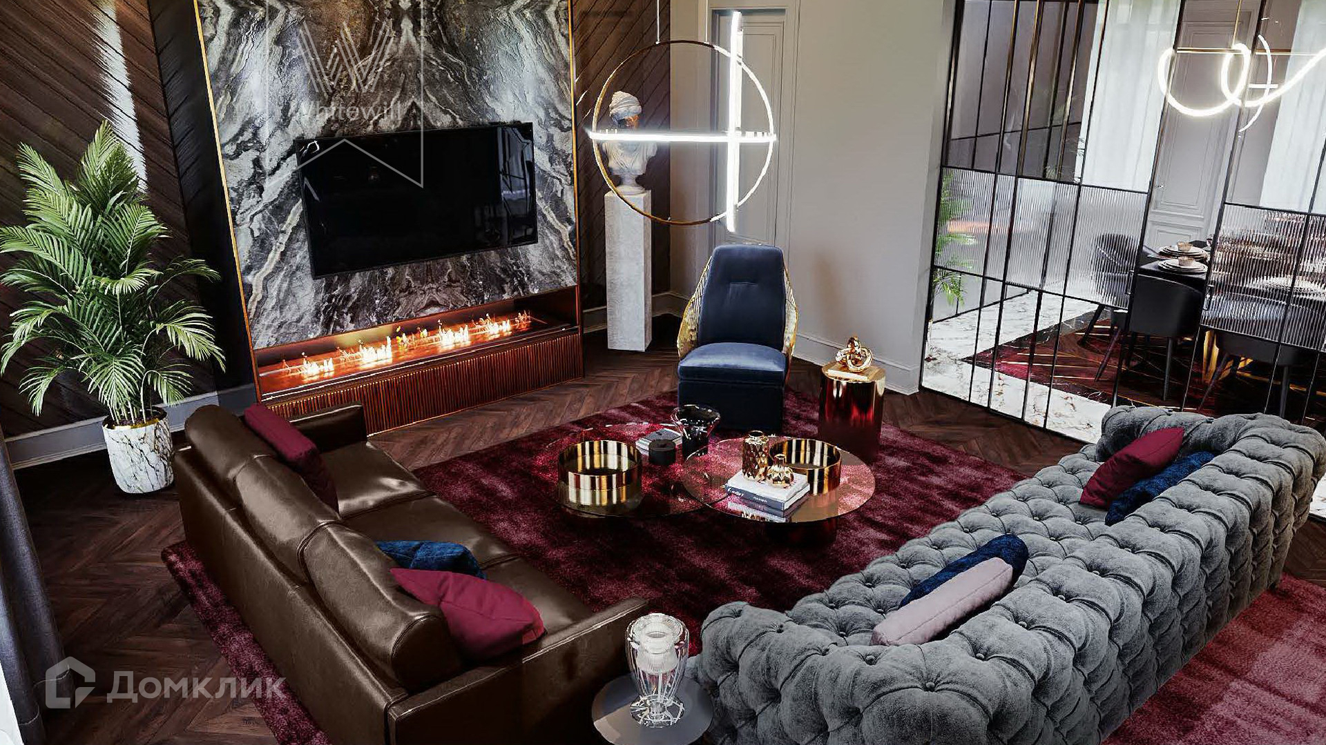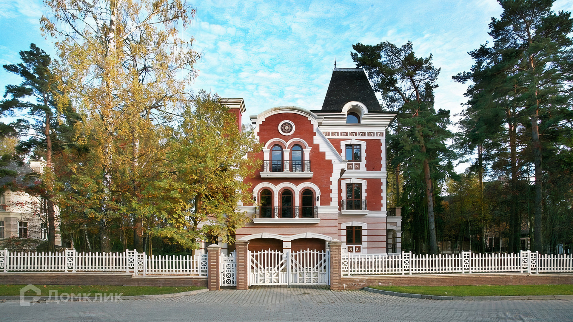 ID 5 489. Довиль. Трехэтажный дом по проекту «Аверон» построен на просторном лесном участке 24 сотки. Старофранцузский фасад из красного кирпича украшен рустовкой, карнизами, лепниной. Интерьер сочетает элементы современности и классики, в отделке использованы фактура камня и дерева, лепнина и позолота. В доме разместили 5 спален, гостиную с камином и вторым светом, кухню-столовую, кабинет с балконом, библиотеку и комнату отдыха. В контуре дома предусмотрен гараж на 2 машины.