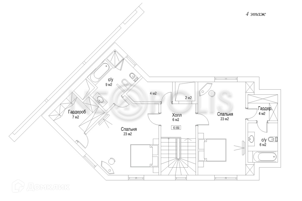4 этаж: холл, 2 спальни, 2 санузла, 2 гардеробные.