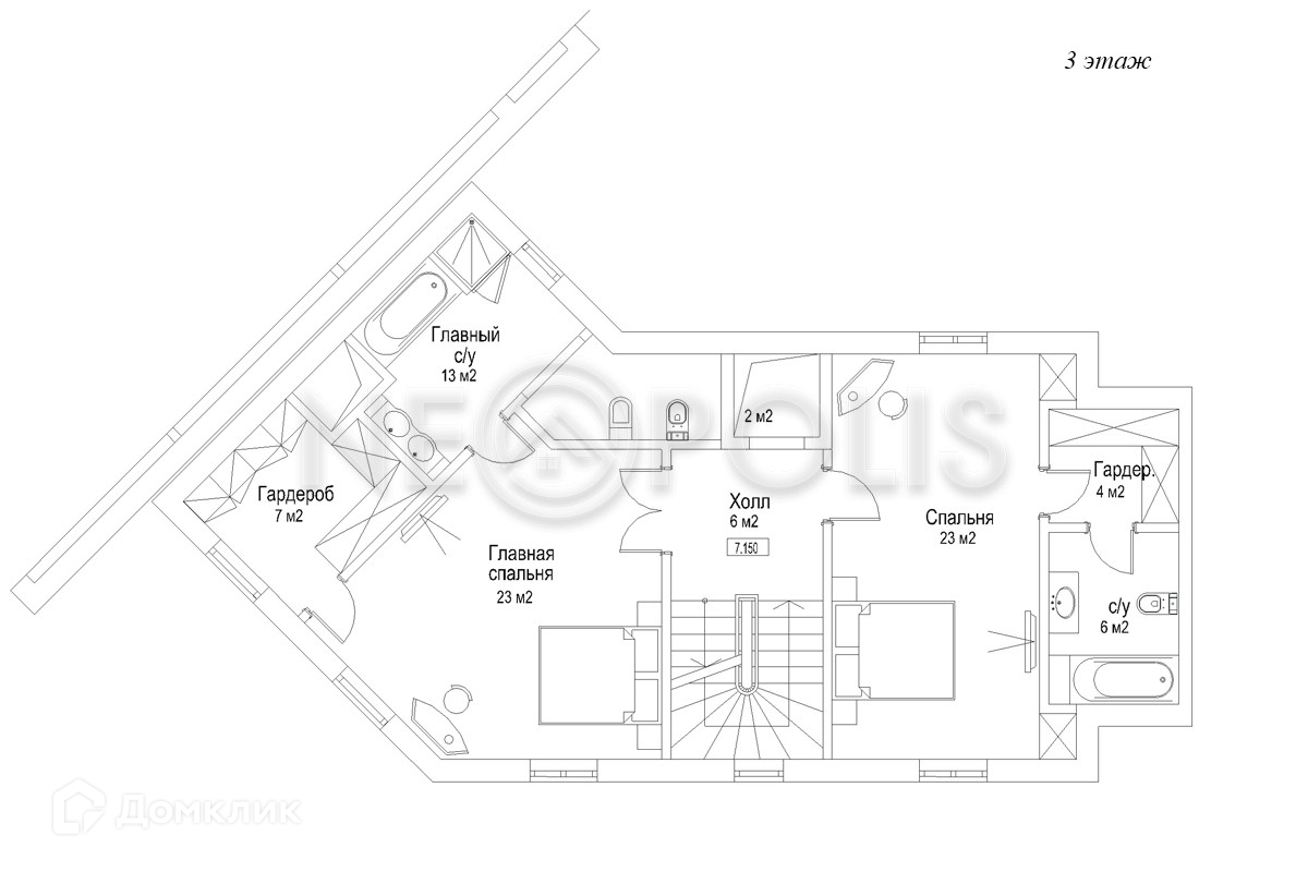 3 этаж: холл, 2 спальни, 2 санузла, 2 гардеробные.
