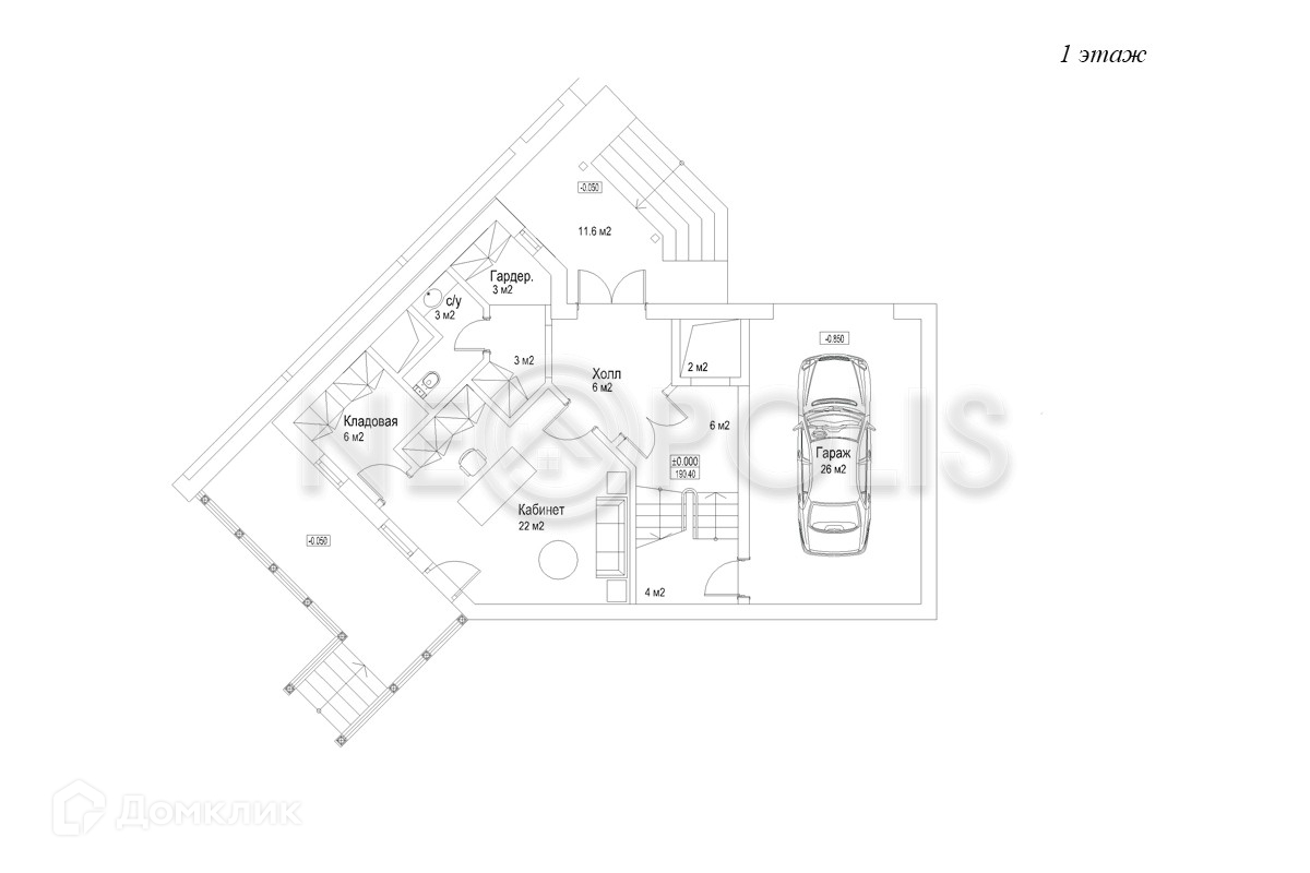 1 этаж: холл, кабинет, санузел, гардеробная, кладовая, гараж на 1 авто.