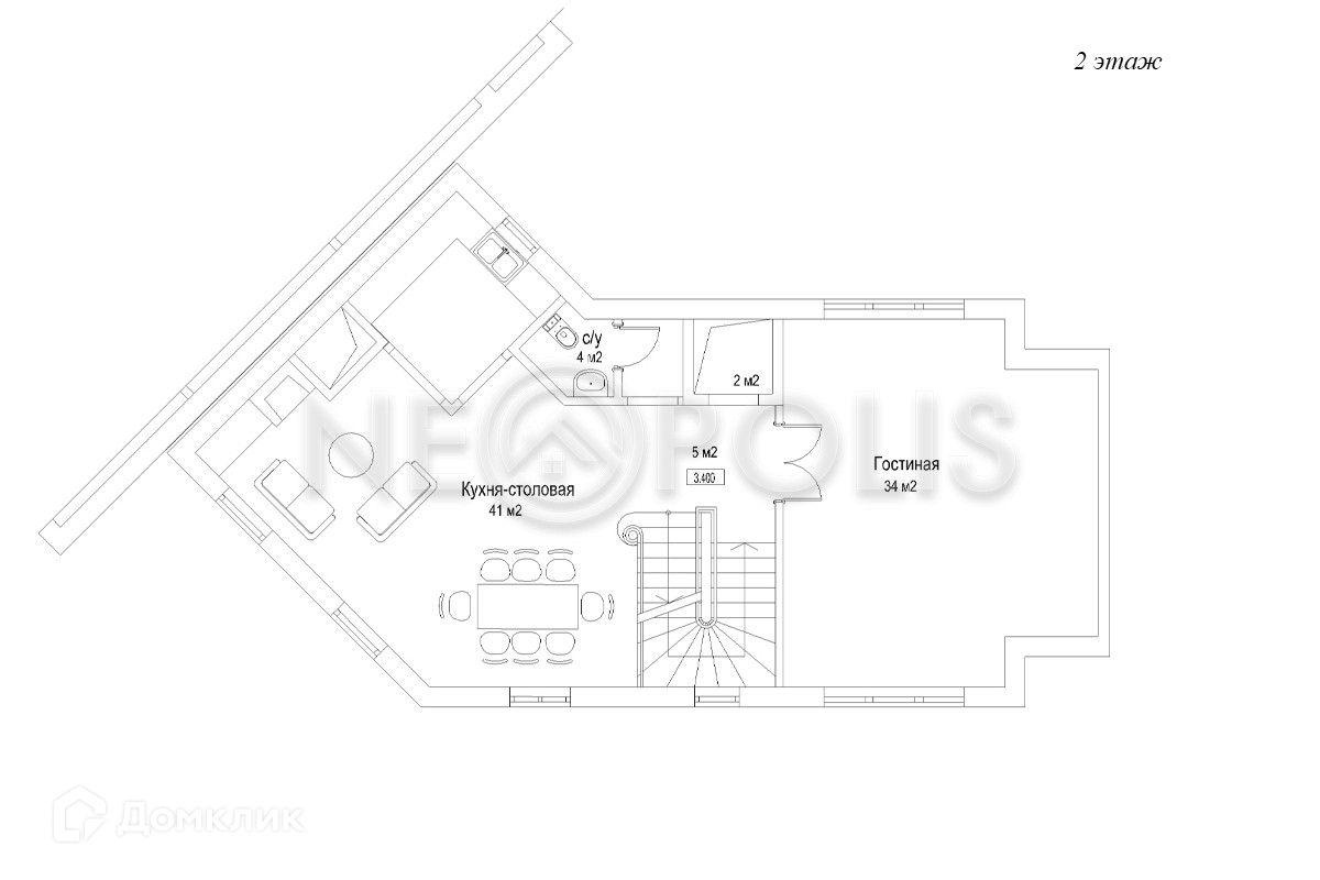 2 этаж: гостиная, кухня-столовая, санузел.