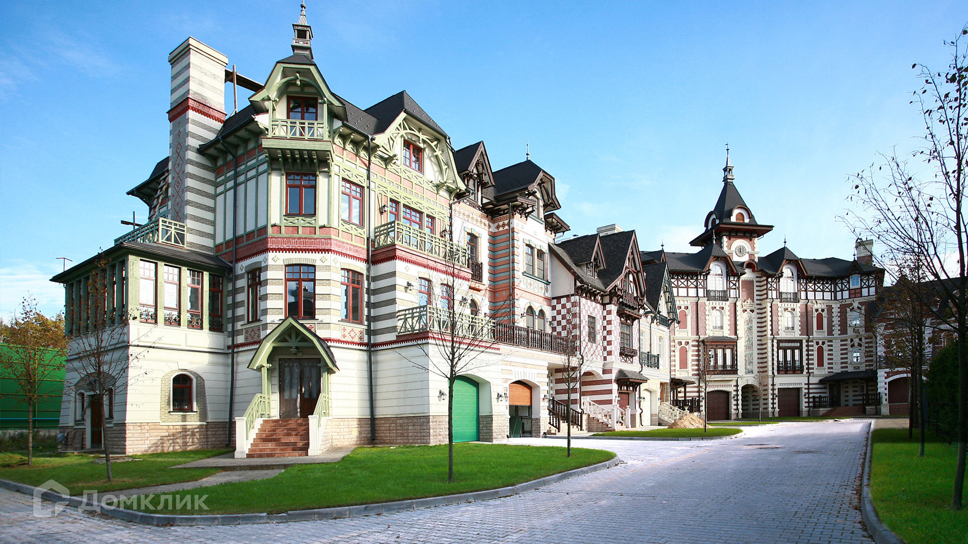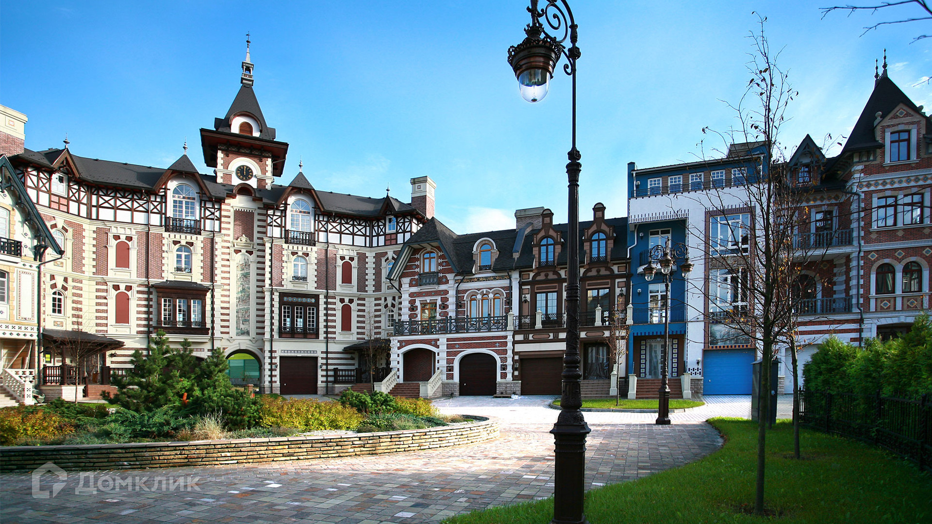 ID 9 773. Довиль. Семейный четырехэтажный таунхаус во фламандском стиле площадью 385 м² без отделки расположен в правой части здания с башенкой. Фасад богато украшен рустовкой, декоративными балками в стиле «фахверк», мозаикой и клинкером. На первом этаже расположен гараж для машины и технические помещения. На втором этаже кухня-столовая и гостиная. Два верхних этажа занимают 4 спальни с санузлами и гардеробными. Через таунхаус проходит шахта лифта. К таунхаусу примыкает участок 5,6 соток с газоном, где можно разместить зону барбекю.