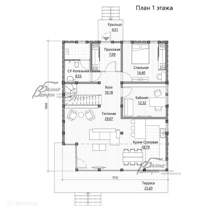 1-ый этаж: Свободная планировка: предполагается: крыльцо 4,5 кв.м, прихожая с гардеробной 7кв.м, холл 10 кв.м, кухня-столовая 18,8 кв.м, гостиная 29 кв.м со вторым светом и с выходом на террасу 26 кв.м, спальня 14,4 кв.м, кабинет 12,3 кв.м, санузел /котельная 8,5 кв.м.