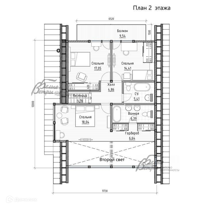 2-ой этаж: Свободная планировка: предполагается: холл 5 кв.м, мастер спальня 18 кв.м с гардеробной 7 кв.м и с санузлом 6 кв.м, спальня 17 кв.м, спальня 14 кв.м с выходом на балкон 9,5 кв.м, санузел с ванной 5,4 кв.м.
