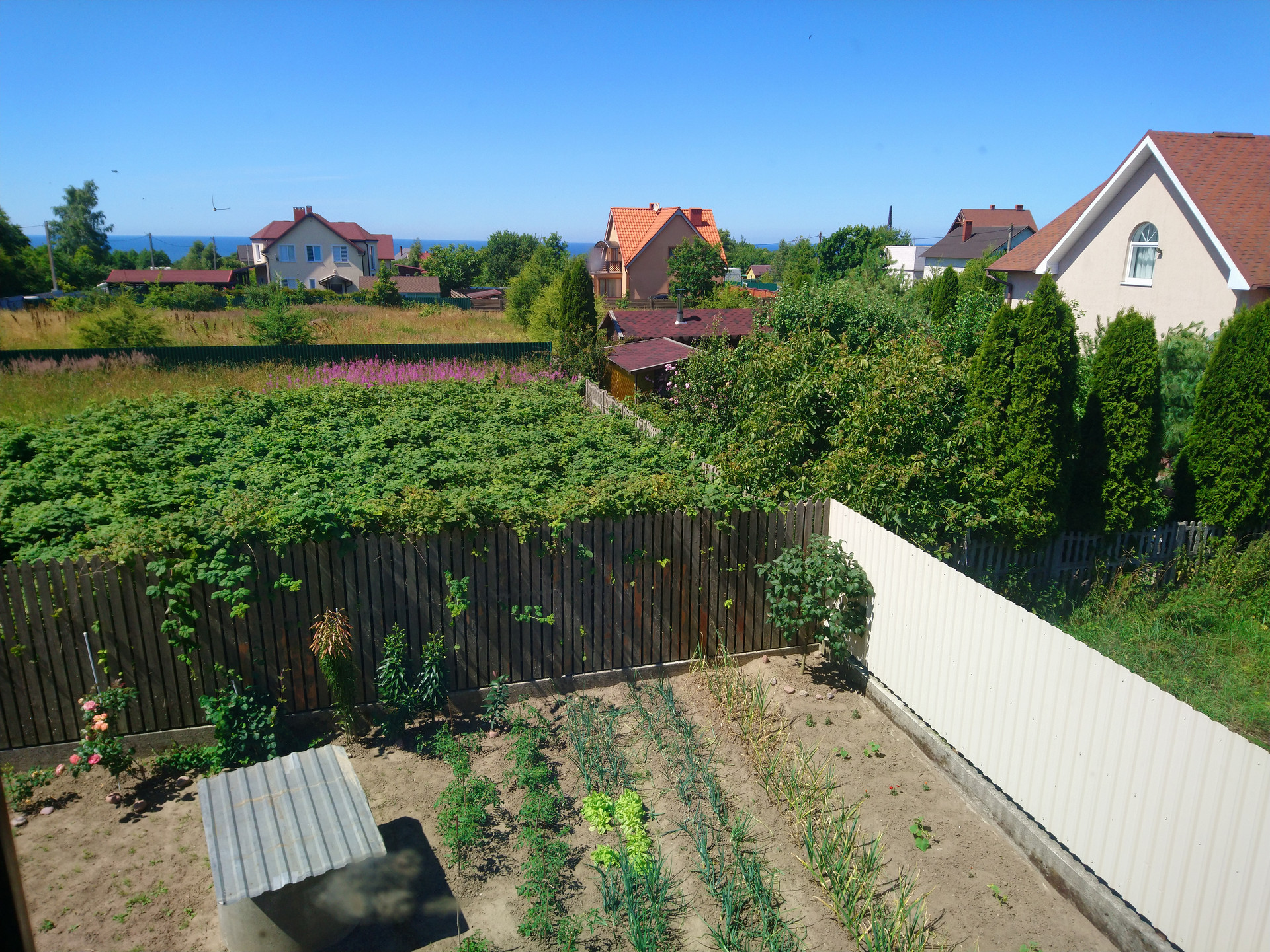 На земельном участке молодые вишня, груша, смородина, крыжовник, клубника, цветы.