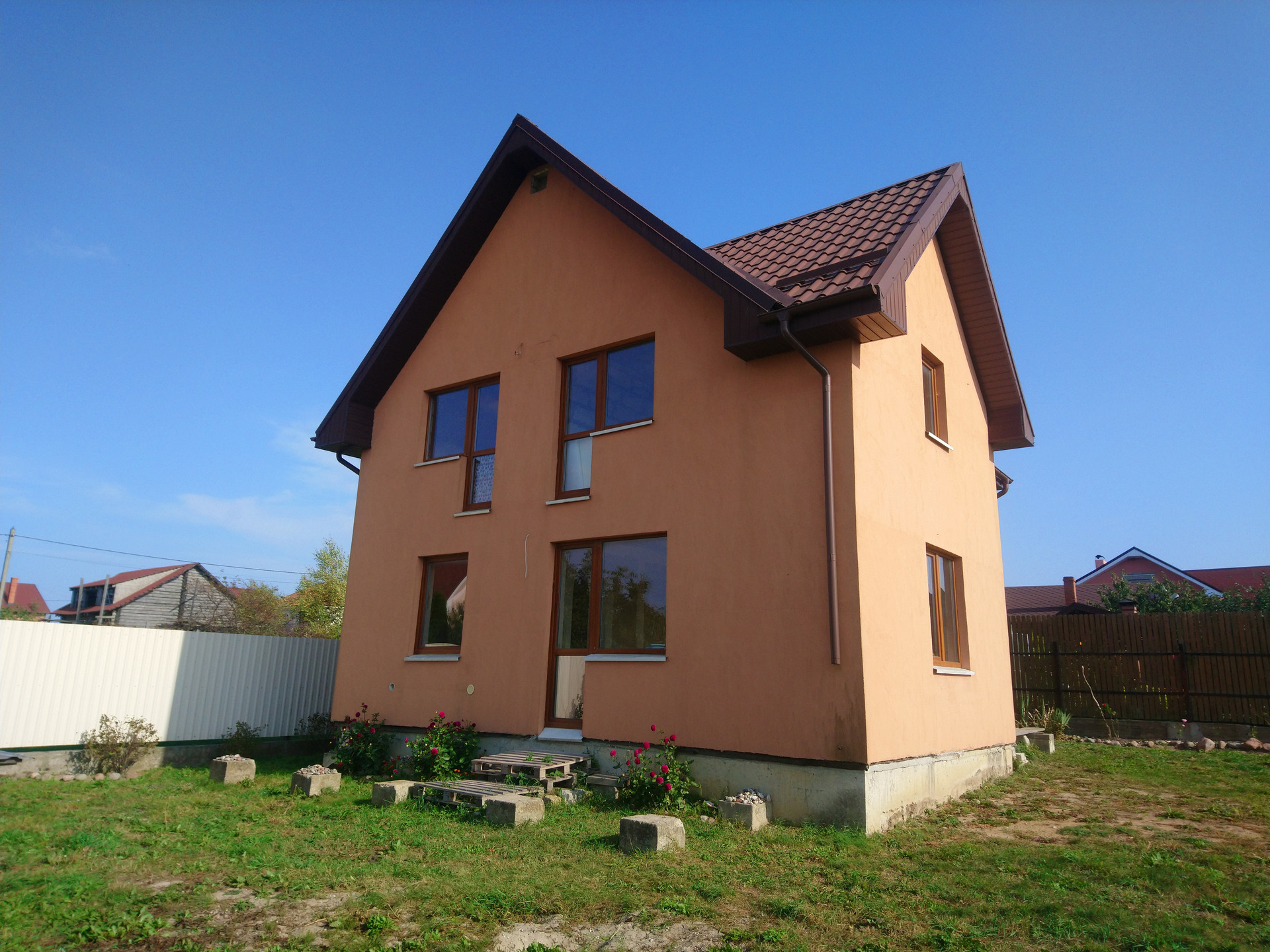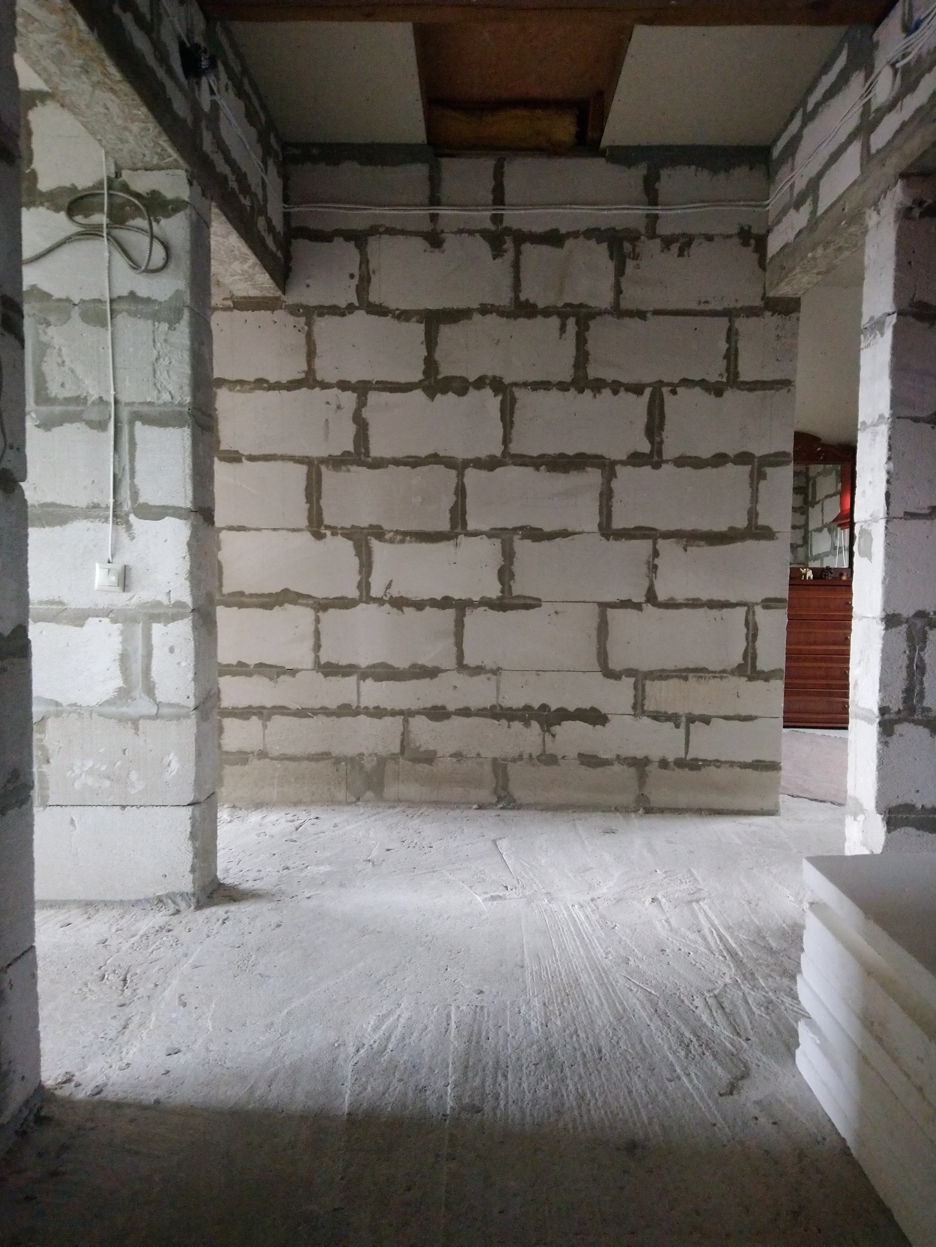 Дом из газосиликатных блоков на монолитной железобетонной плите, межэтажное перекрытие железобетонное, снаружи утеплен и оштукатурен.
