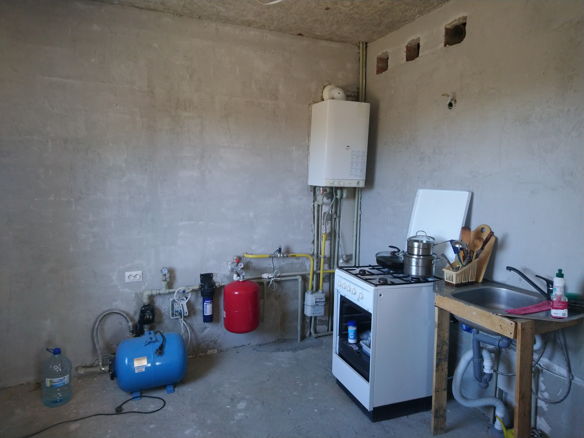 Сделаны: теплый пол на первом этаже водяной от газового котла, кафель в санузле первого этажа, теплый пол в санузле второго этажа; на кухне газовый котел, газовая плита; вода, канализация- свой септик, электричество .