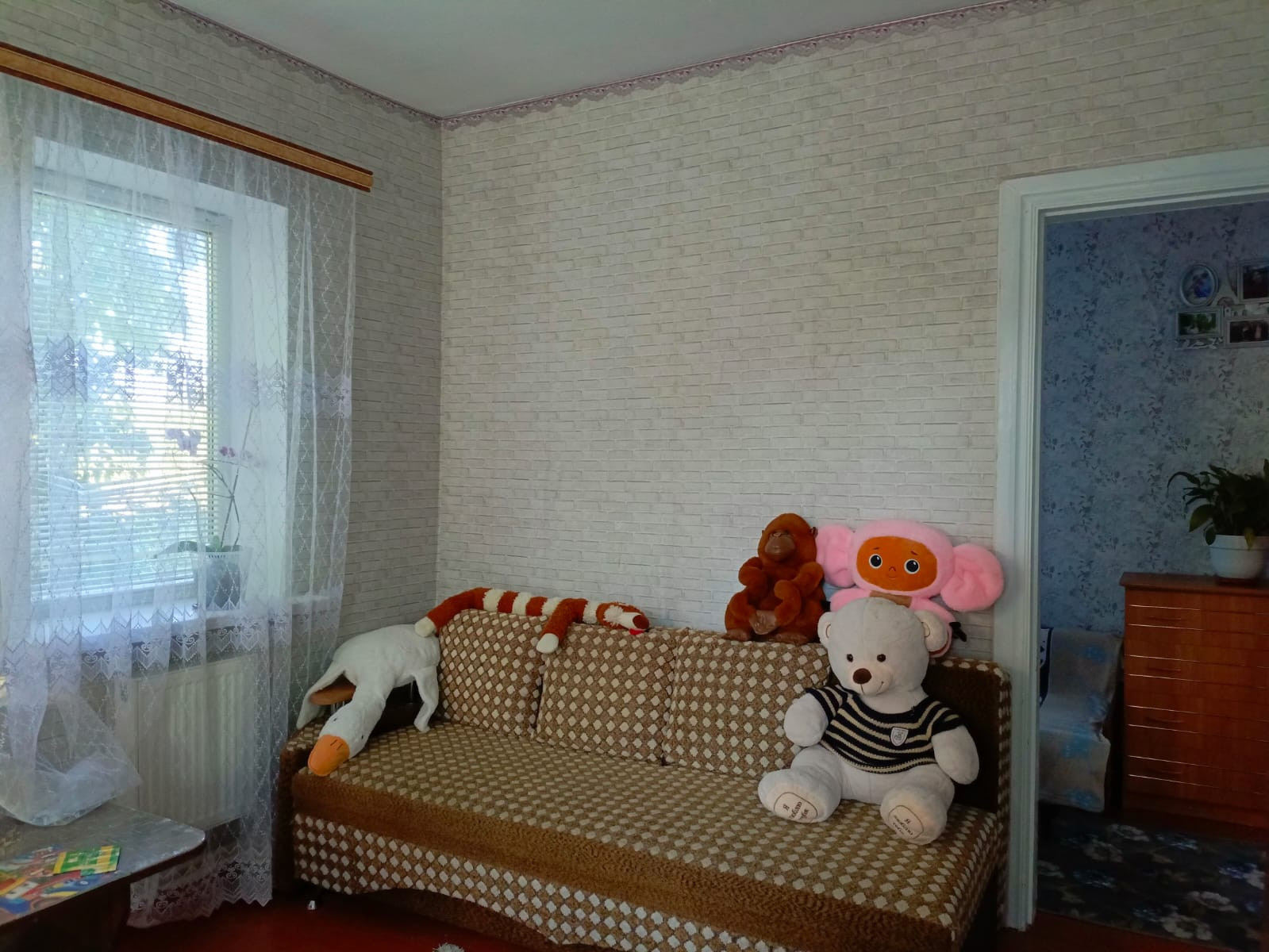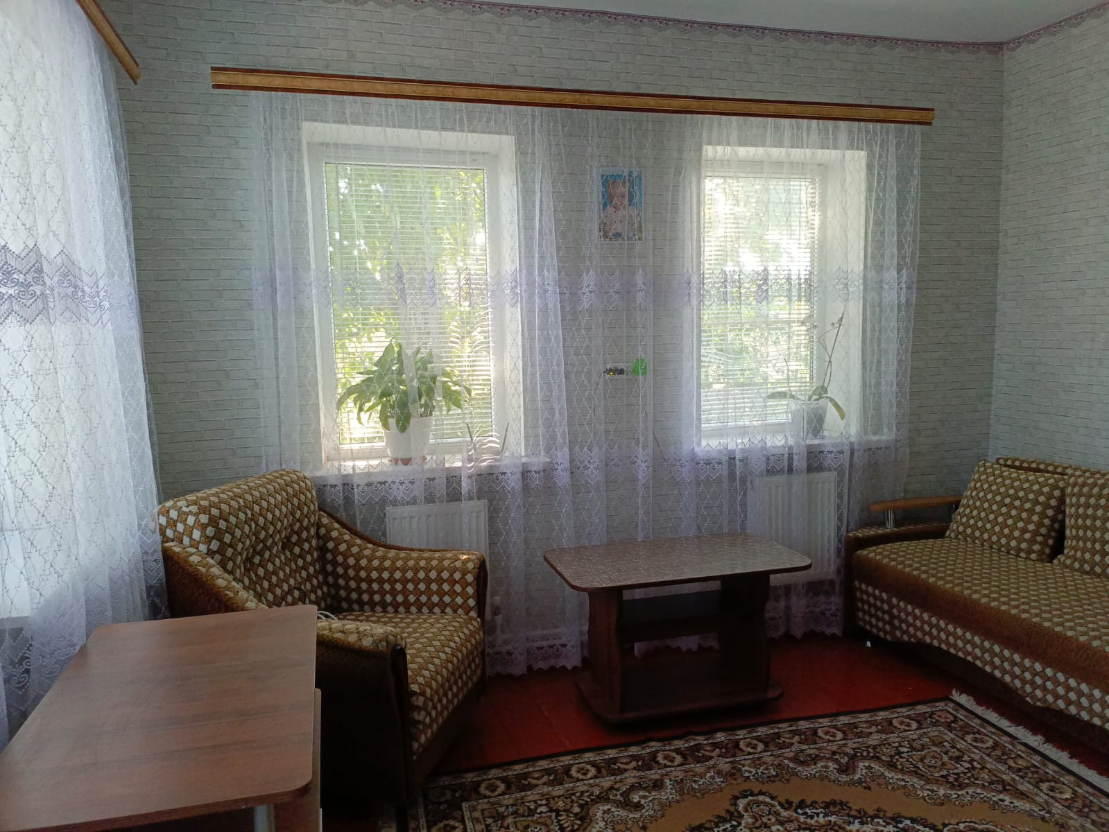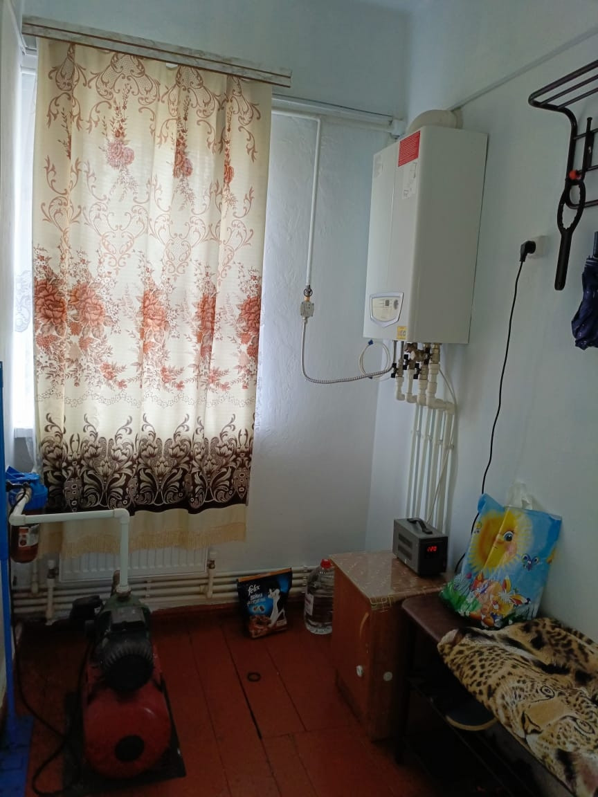 Сам домик кирпичный, крепкий, с крыльцом. В прихожей есть котёл водонагревающий, насос что качает свою воду, выход на чердак и подпол. При желании можно там установить унитаз, перегородку и провести канализацию через подпол, септик уже есть. Дом круговой, 2 жилые комнаты, одна не большая, другая просторная. С небольшой есть 2й выход в подпол. Есть просторная кухня-гостиная, там же поставили душевую кабинку, при желании можно поставить стену из гипсокартона, у нас там жил 1 человек, поэтому не стали заморачиваться. Отопление современное, окна пластиковые.