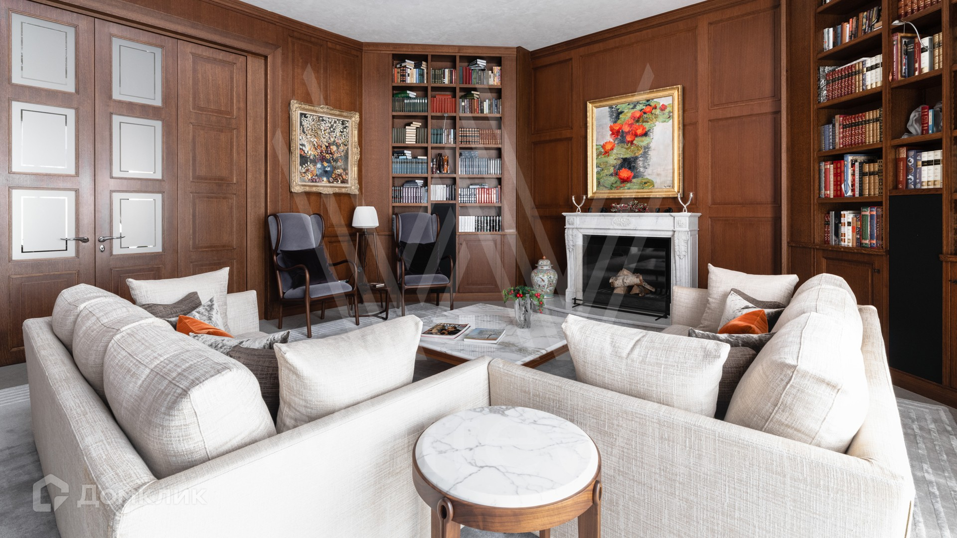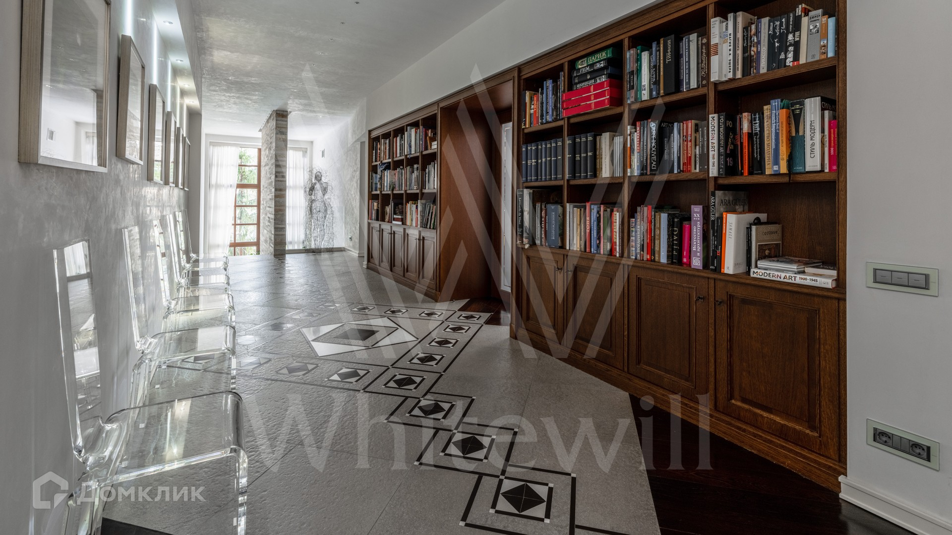 1-й уровень: прихожая, гостевой санузел, гостиная, кухня, библиотека.
