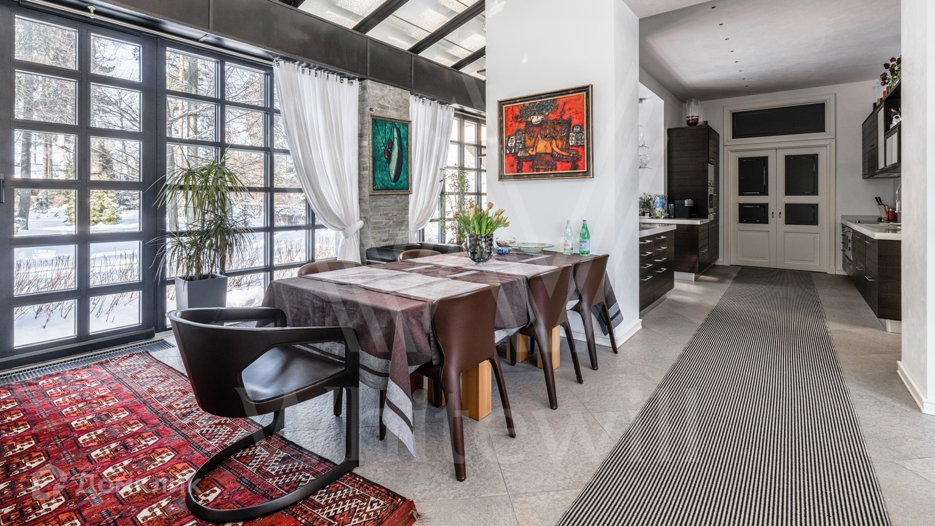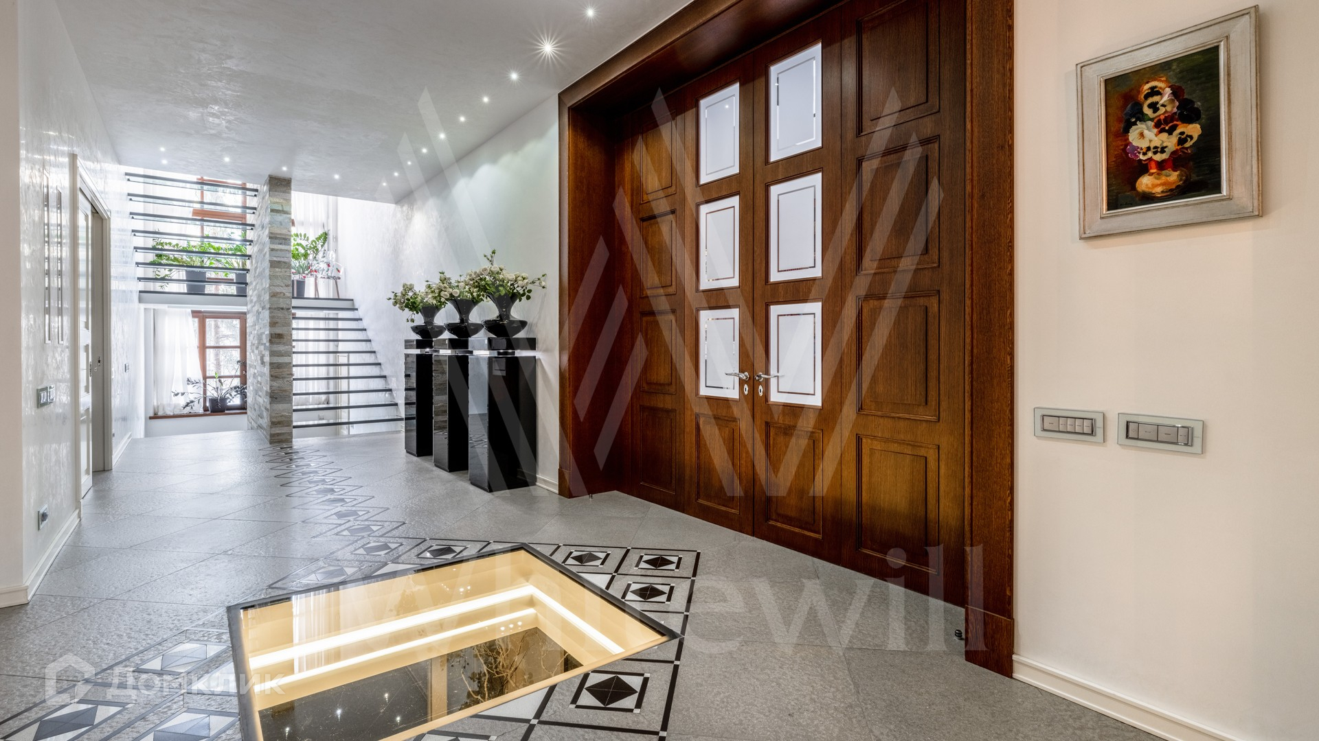 ID 11 925. ДСК Мичуринец. Загородный дом площадью 850 м² построен на просторном участке 56 соток с лесными деревьями. Современный фасад здания облицован бежевой штукатуркой и под разные оттенки камня, а также декорирован коваными элементами. В интерьере выполнена дорогая отделка, установлены мебель и люстры из Италии. Планировкой резиденции предусмотрены 4 спальни, в одной из которых разместили кабинет с панно из мозаики, которое делали итальянские мастера, гостиная с камином, вторым светом и большой библиотекой, кухня с выходом на зону барбекю, спортзал, домашний кинотеатр в венецианском стиле и бильярдную. Рядом с основным домом расположены SPA-комплекс с хаммамом и сауной, дом для персонала с 2-мя спальнями и гараж на 2 машины. На участке выполнен ландшафтный дизайн, вымощены дорожки и установлено уличное освещение.