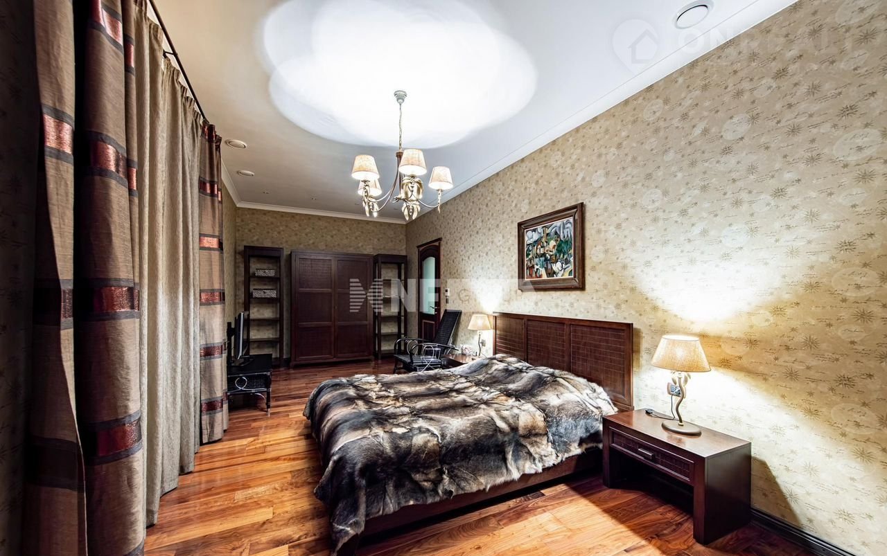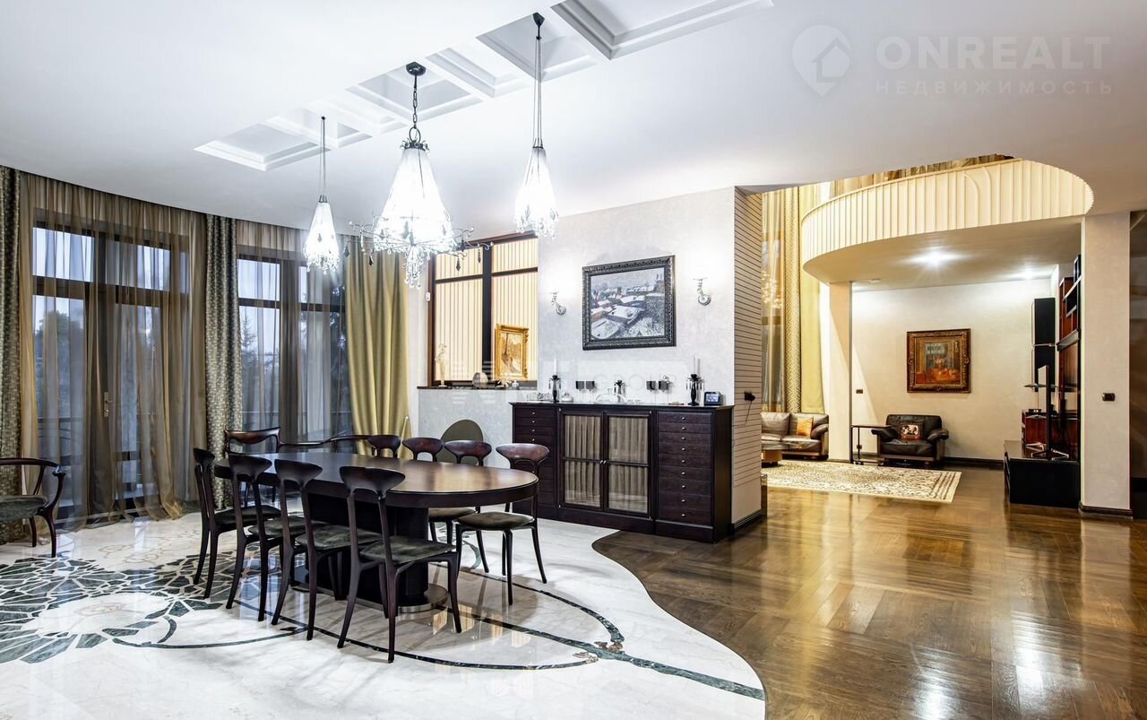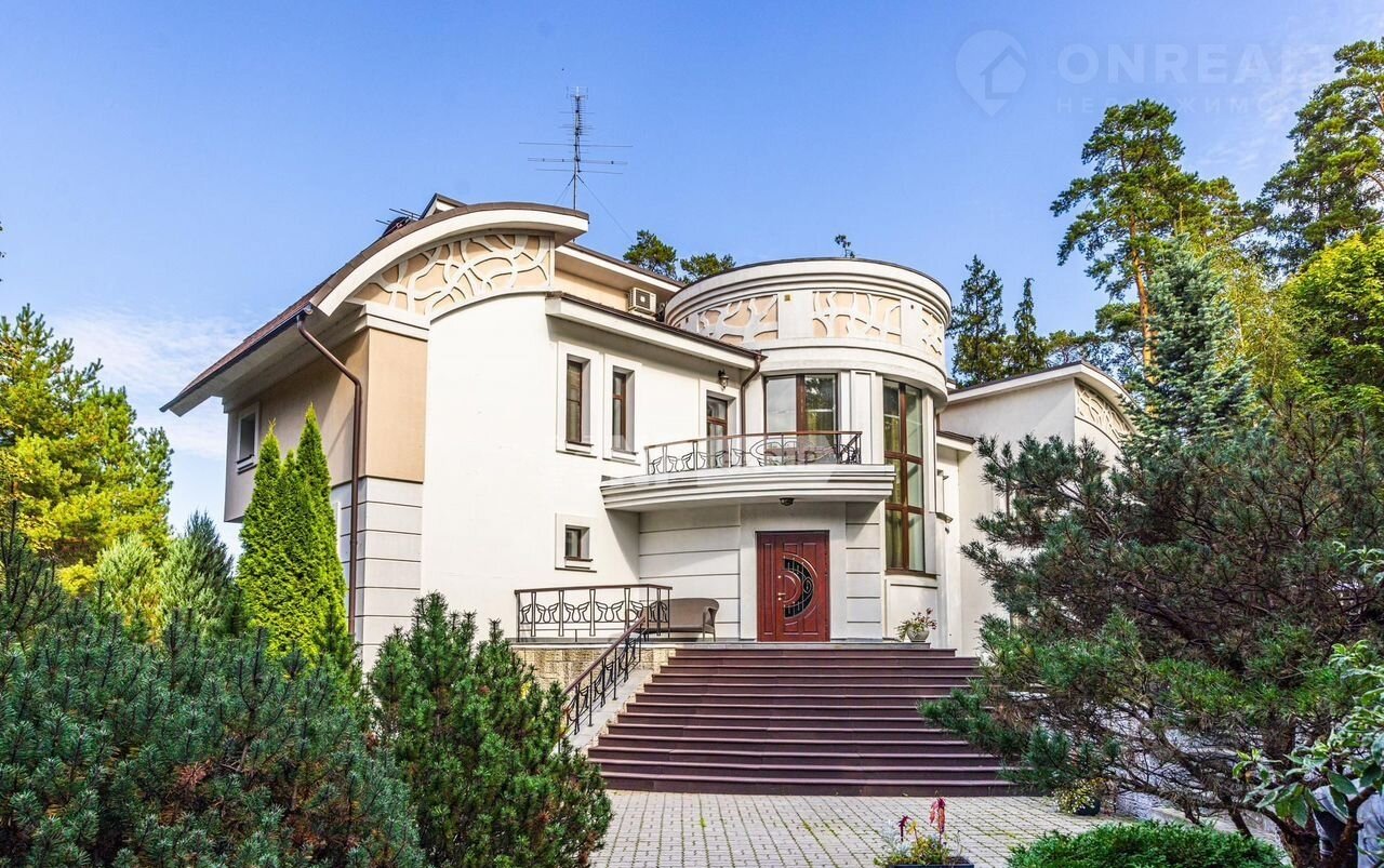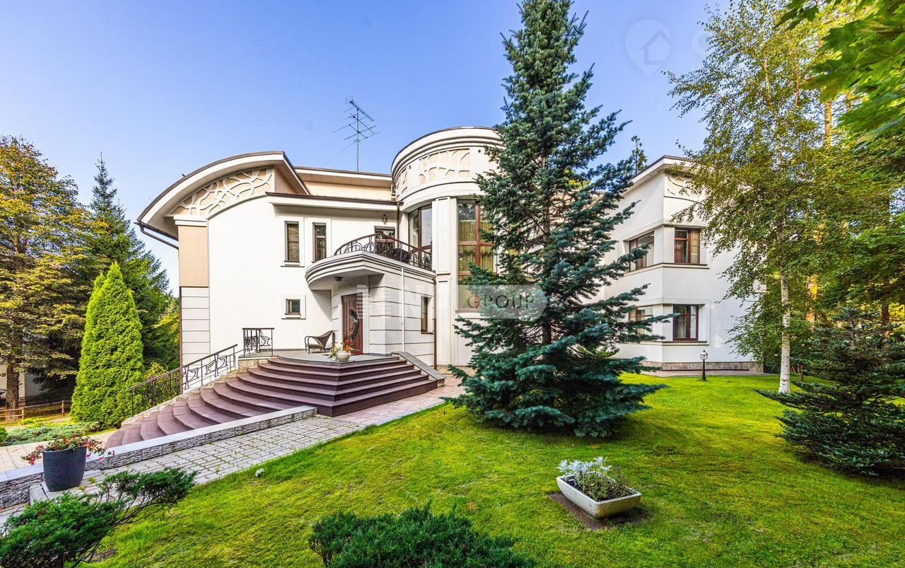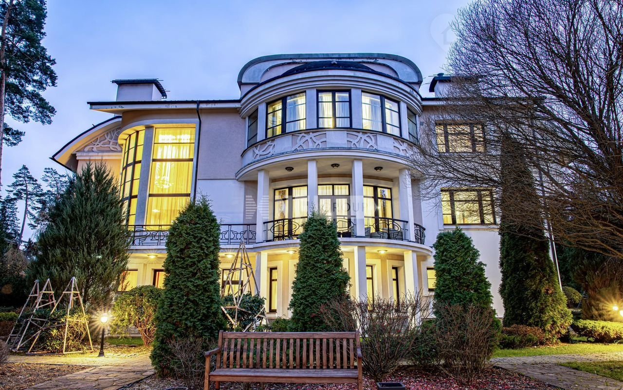 Загородный дом площадью 600 м² построен на просторном прилесном участке 85 соток. Фасад здания с изогнутой архитектурой облицован бежевой штукатуркой, декорирован рустовкой, абстрактными узорами и коваными элементами. В отделке интерьера преобладают светлые оттенки в сочетании с фактурой дерева и камня. Планировка коттеджа включает 4 спален, большую гостиную с камином и вторым светом, кухню, столовую, кабинет и террасу. Провести свободное время с близкими можно в бильярдной, домашнем кинотеатре или SРА-зоне с купелью и сауной. Поддерживать спортивную форму поможет тренажерный зал. Рядом находится гараж на 2 машины с кладовой, на втором этаже которого расположили блок для персонала с 2-мя спальнями и гостевой блок с гостиной и 2-мя спальнями. На участке с прудами и ручьями выполнен ландшафтный дизайн, установлена система автополива, обустроены беседки, дорожки и уличное освещение.