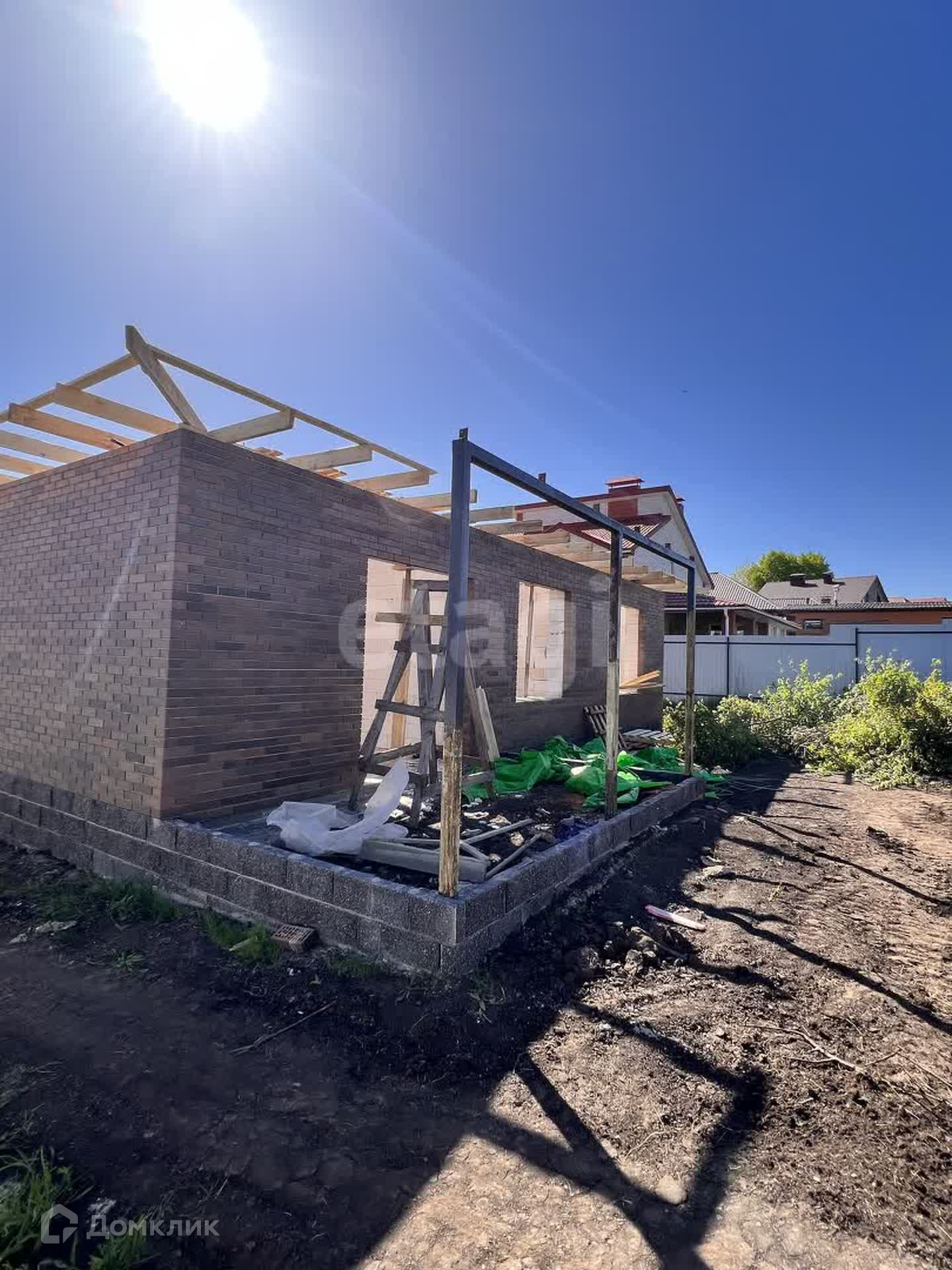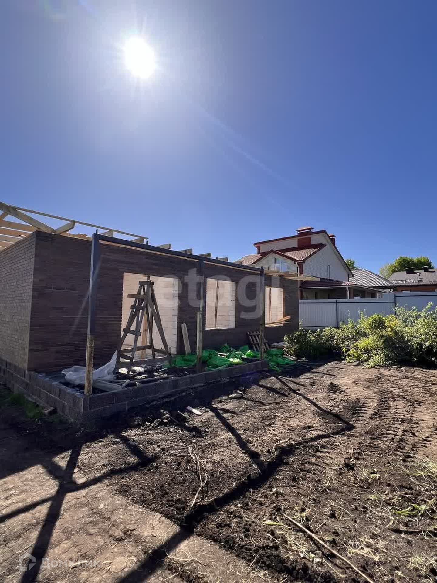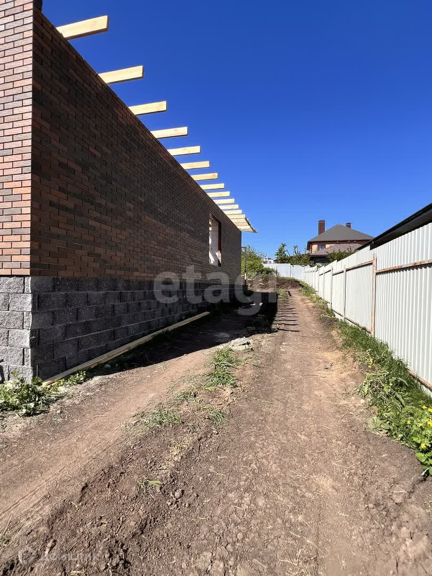 Благоустройство двора-тротуарная плитка (по всему участку), забор из кирпича. Разведены коммуникации, отопление - батареи и система «тёплый пол» по всему дому.