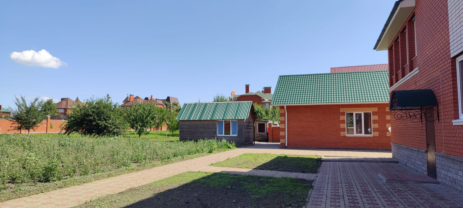 Вдоль ограждения высажены декоративные деревья. На участке есть огород, хоз постройки, навес для стоянки автомобиля, большой плодоносный сад.