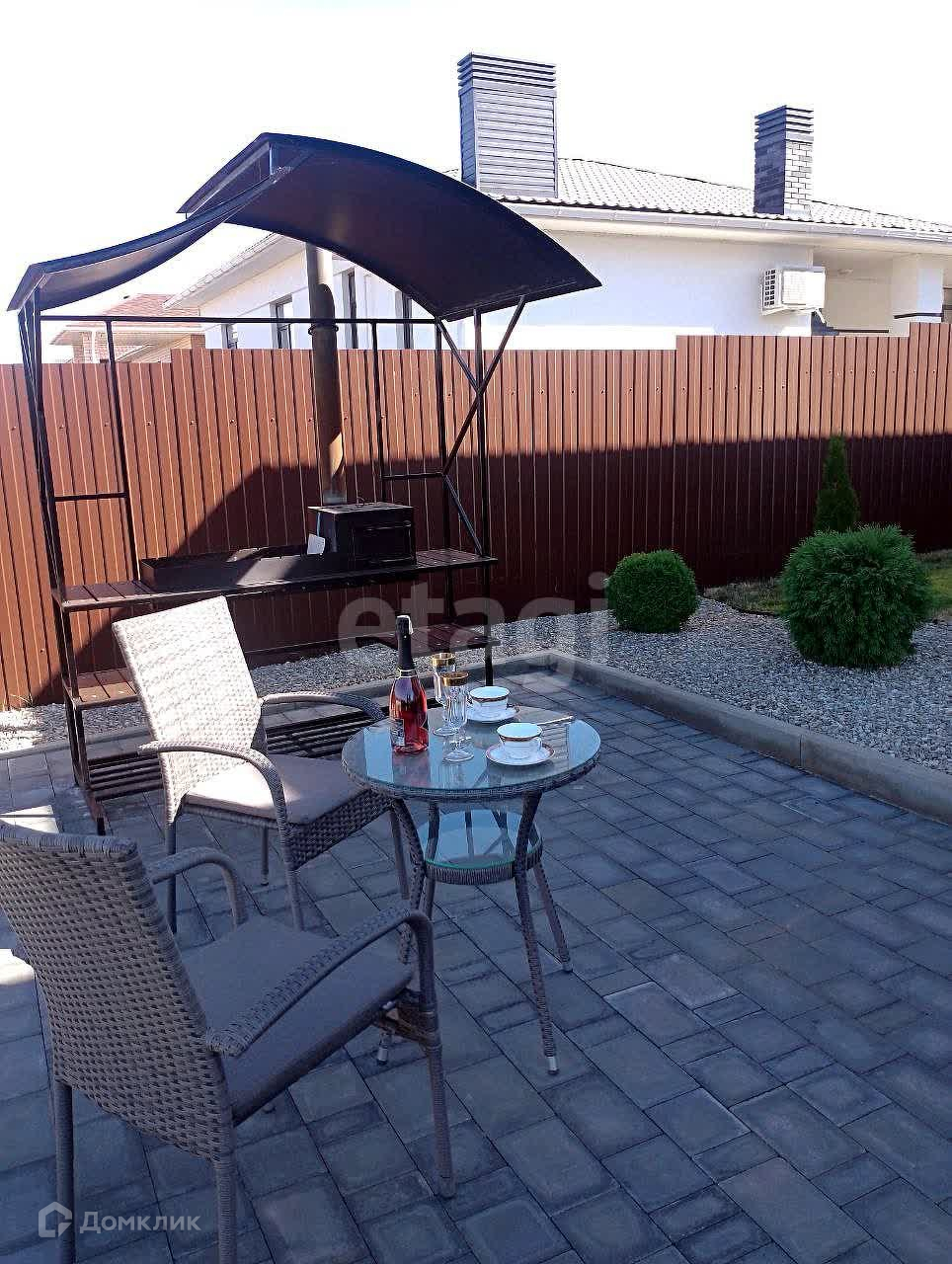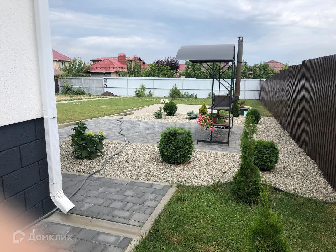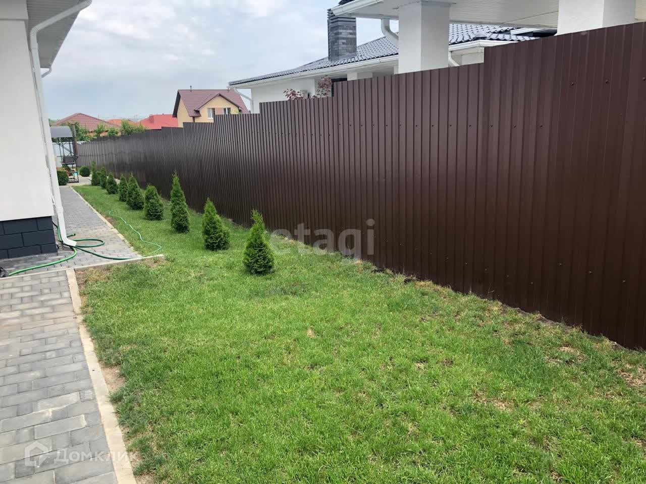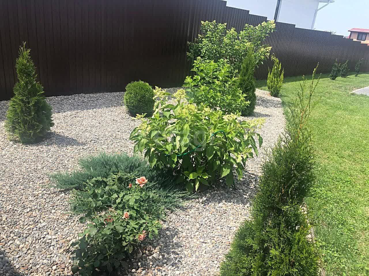 Вокруг дома полностью благоустроенная территория: на участке высажены туи, крымская сосна, австралийская сосна, гортензии на штамбе и кустовые, розы штамбовые и кустовые, карликовые ёлки и сосны, можжевельники. Все растения посажены с большой любовью и заботой. Есть навес под автомобиль площадью 31 кв.м. с освещением в вечернее время. Оборудована мангальная зона, высокие грядки. Со всех сторон дома - забор, ворота - автоматические, есть складское помещение. В доме проведены все необходимые коммуникации: центральный газ, свет, вода, септик. Установлен мощный фильтр очистки воды не только питьевой, но и для всего дома.