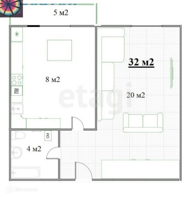 Общая площадь 32.5 м2