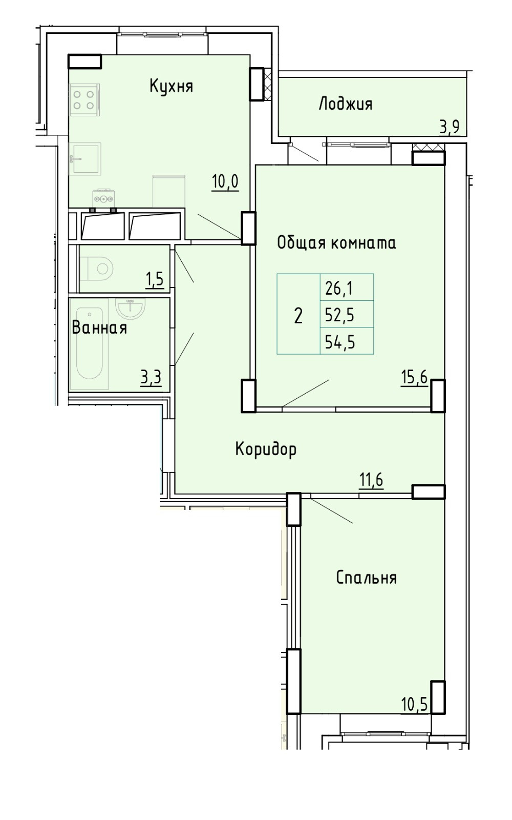 Общая площадь 54.4 м2