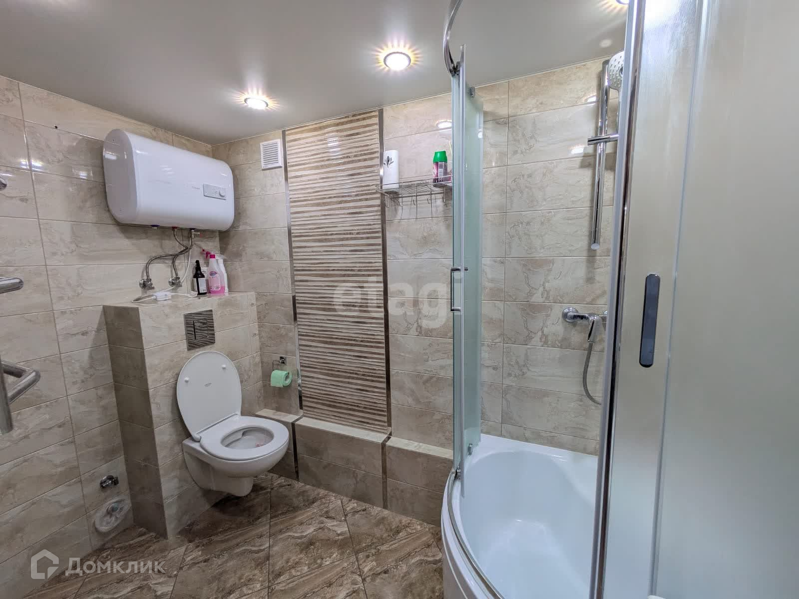 - Современный совместный санузел с новой плиткой и кафелем.