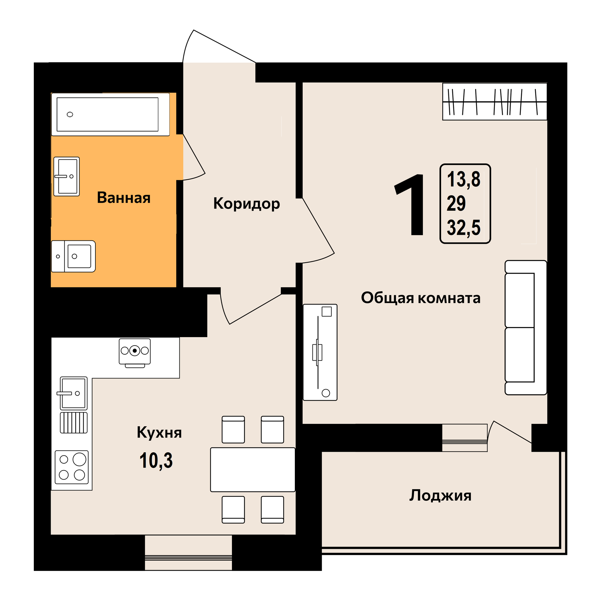Общая площадь квартиры 32,5м2, комната 13,8 м2 с выходом на лоджию, кухня 10,3 м2