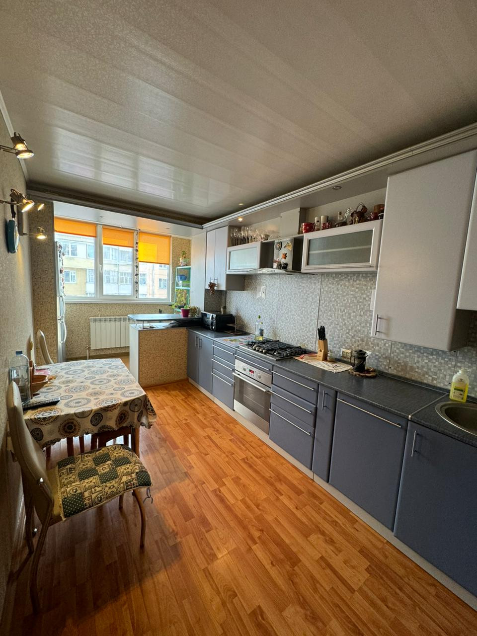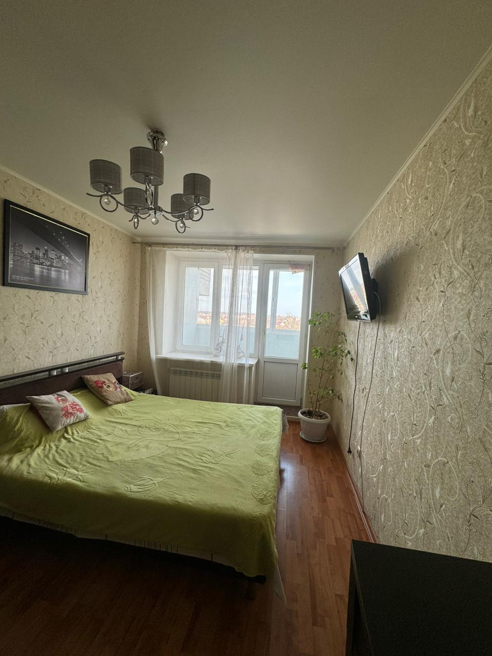 Просторная светлая квартира, состоящая из 3-х комнат (спальня с балконом, детская комната с балконом, просторный зал), кухня с балконом ,расположенная на 4 этаже 5 этажного дома.Балконы остеклены, с видом на центр посёлка Сан. узел, ванная комната отделаны плиткой.