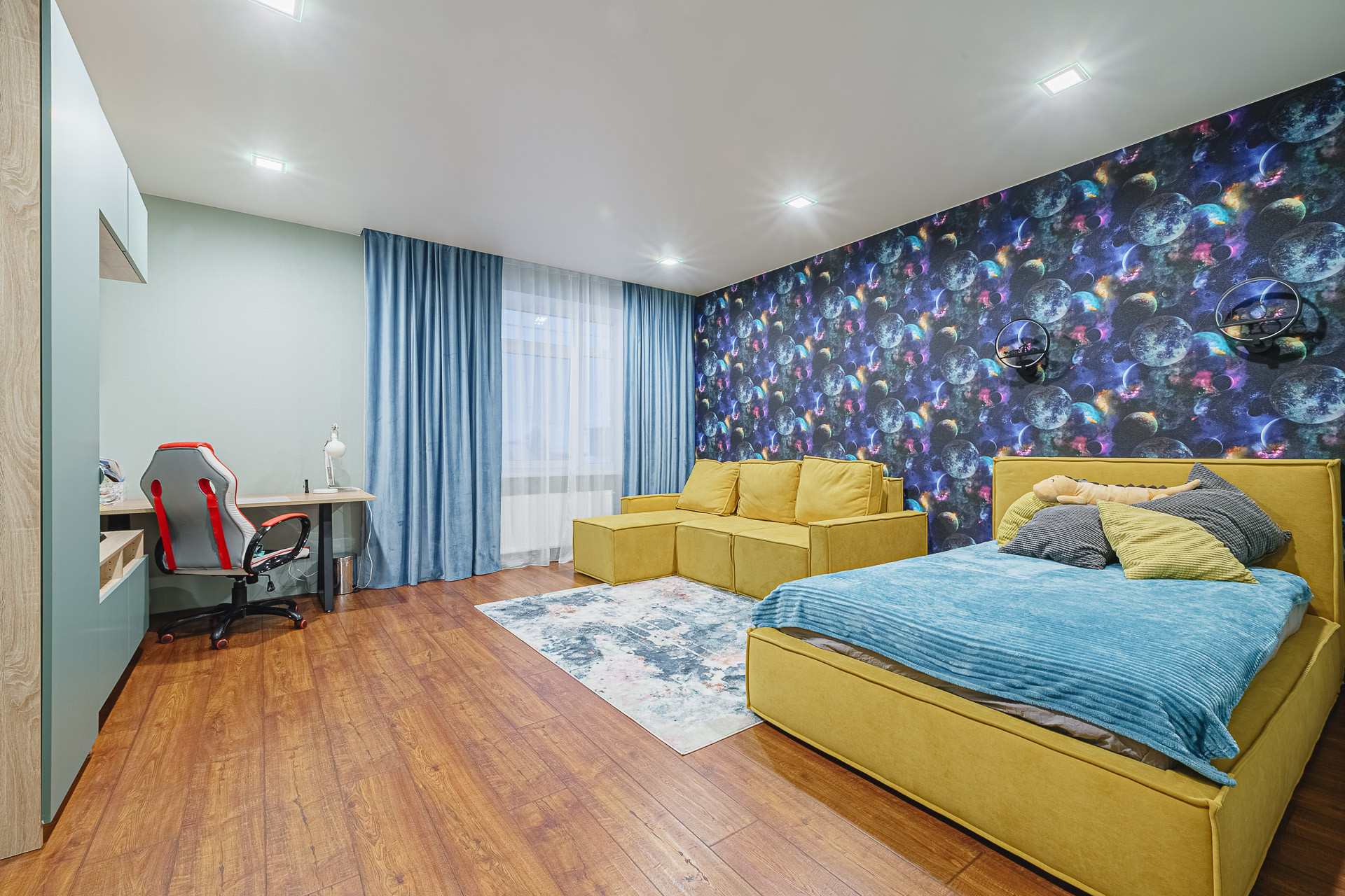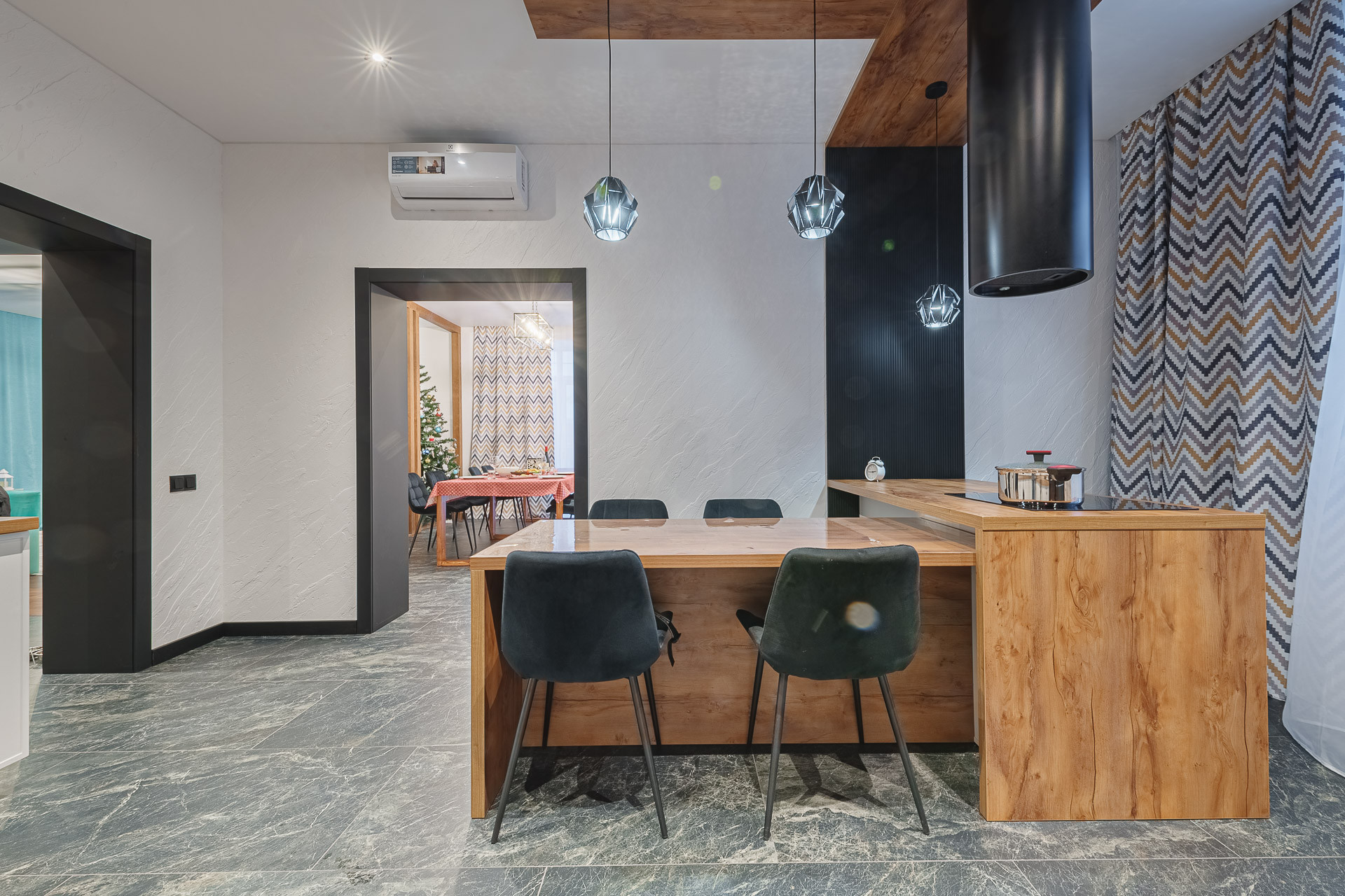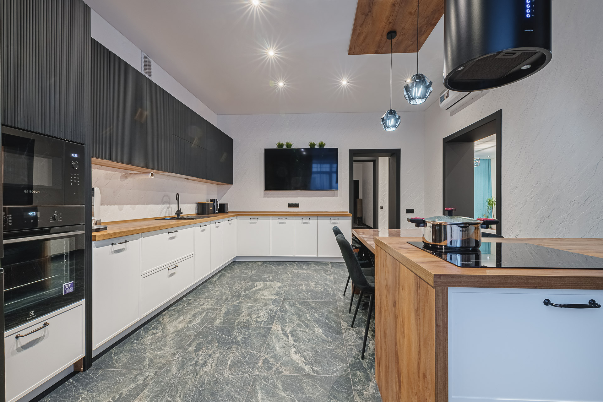 Дизайнерский ремонт с использованием высококачественных материалов. Мебель изготовлена на заказ индивидуально.