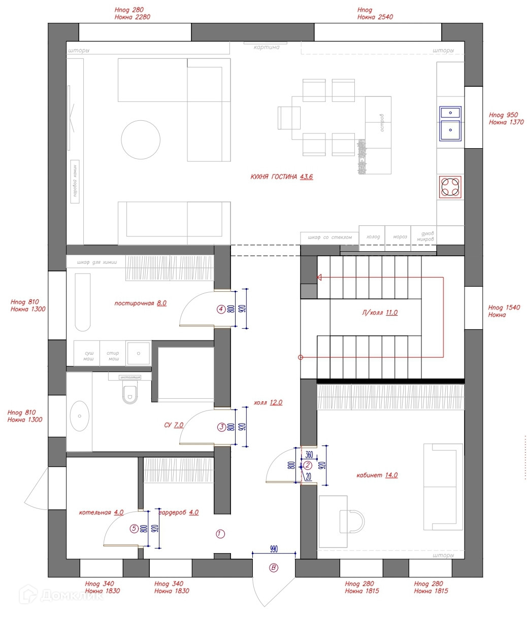 Просторный холл, котельная, хоз. комната, гостевая спальня и кухня-гостиная с панорамным остеклением и выходом на террасу.