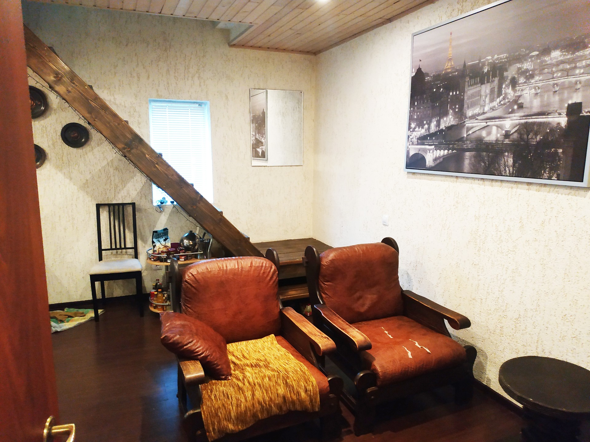 На первом этаже: кухня-гостиная,спальня,с/у.