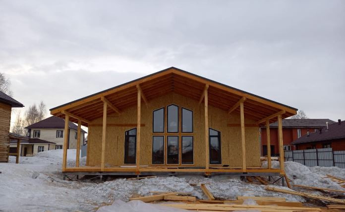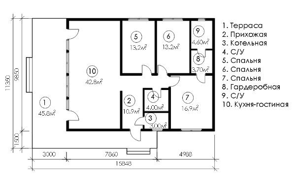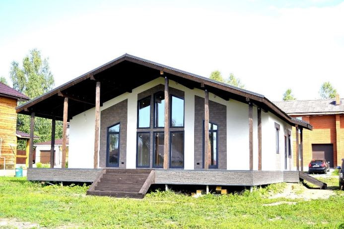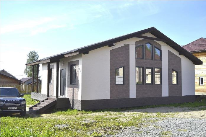Современный одноэтажный дом, где центром выступает гостиная, вокруг которой формируются остальные помещения. Дом имеет три спальни, кухню-гостиную и большую террасу. Идеально подойдет тем, кто хочет иметь современный  дом и не хочет ежедневно подниматься по лестнице на второй этаж.