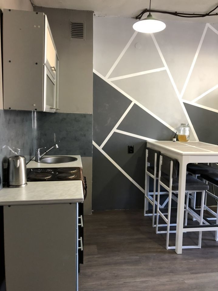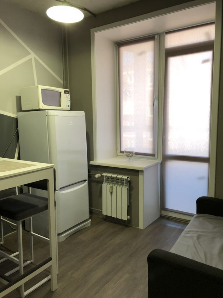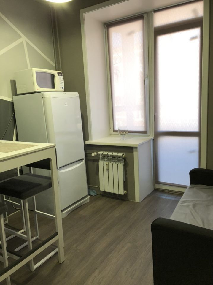 - На кухне присутствуют все бытовые устройства: холодильник, микроволновая печь, кухонный гарнитур, электрическая плита, кухонный стол с барными стульями, а также раскладной мини-диван.