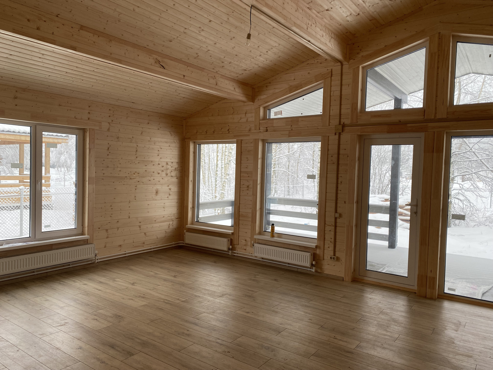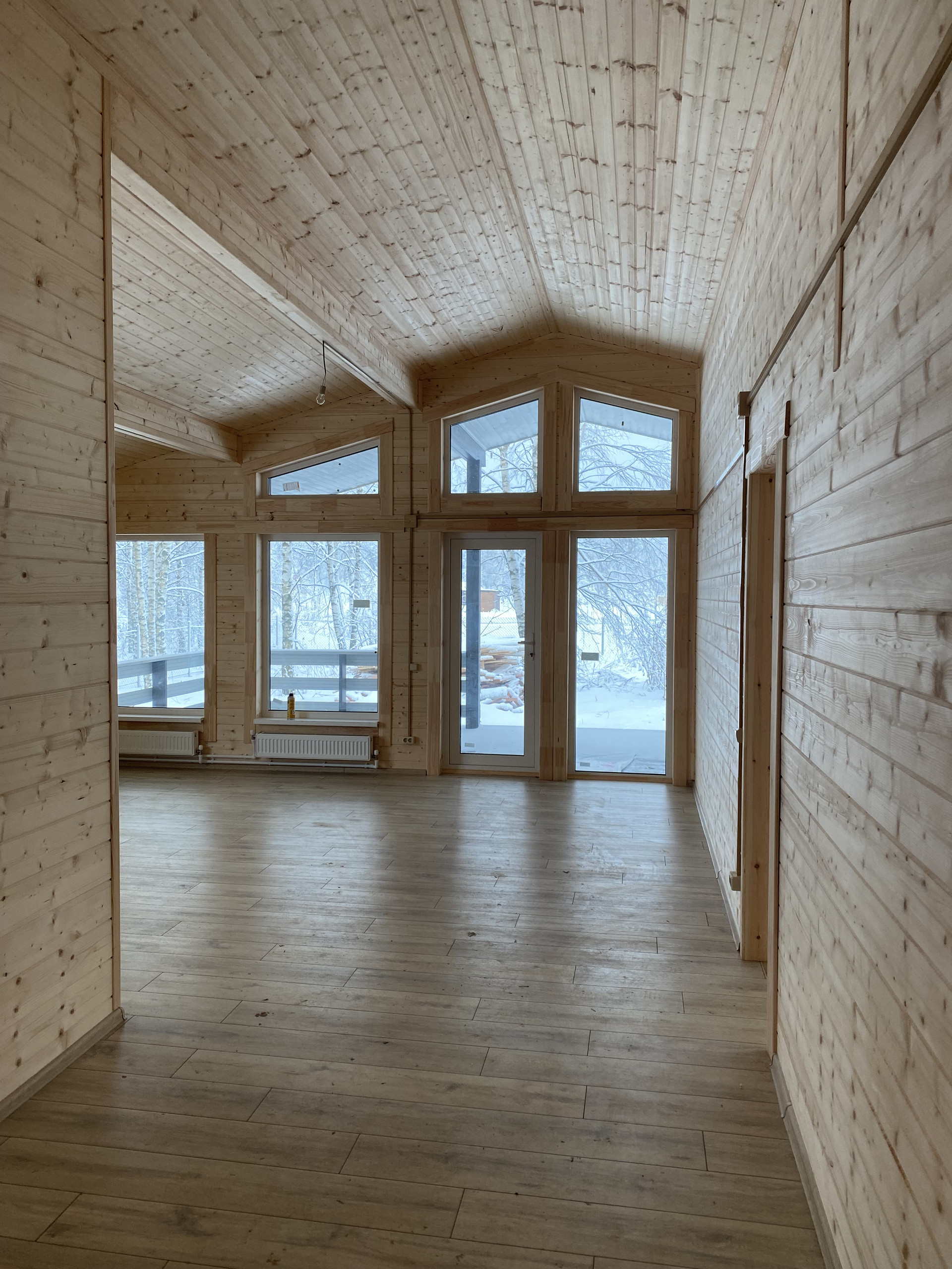Продается новый каркасный дом. В доме кухня-гостиная площадью 26 кв. м с выходом на террасу 27 кв. м, комната 14 кв. м с отдельным санузлом, две комнаты по 13 кв. м, а также еще один отдельный санузел, техническое помещение, холл и тамбур.