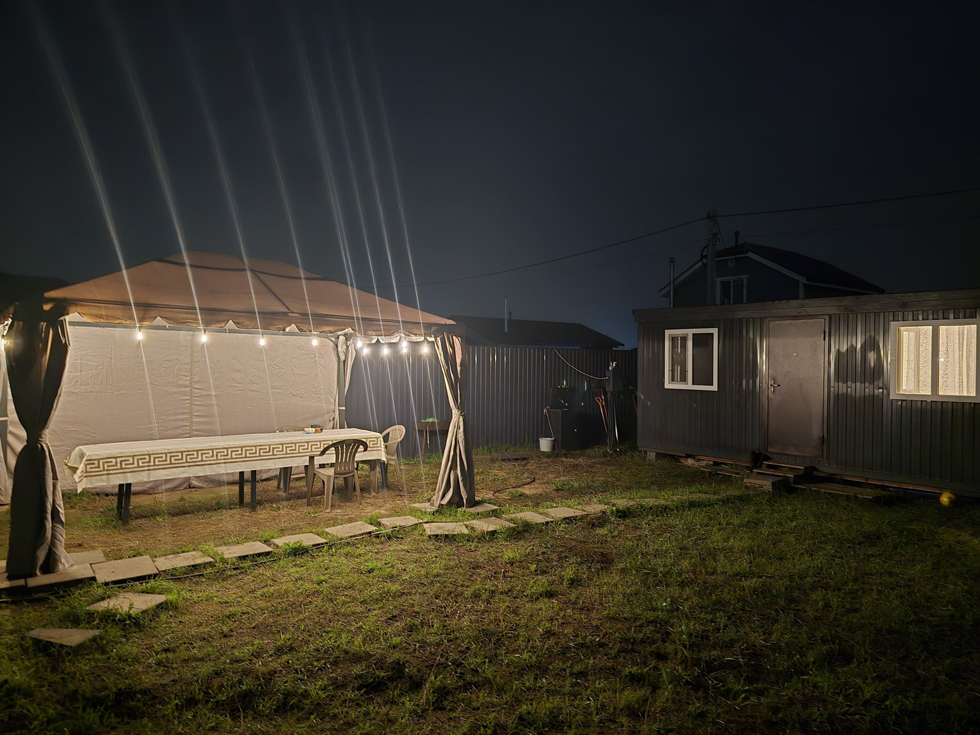 Посажены несколько взрослых деревьев. Палатка уличная со шторками и уличным освещением.
