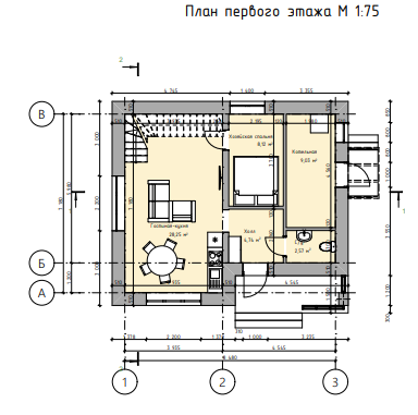 На первом этаже расположены: холл, гостинная-кухня, спальня, санузел, котельная.