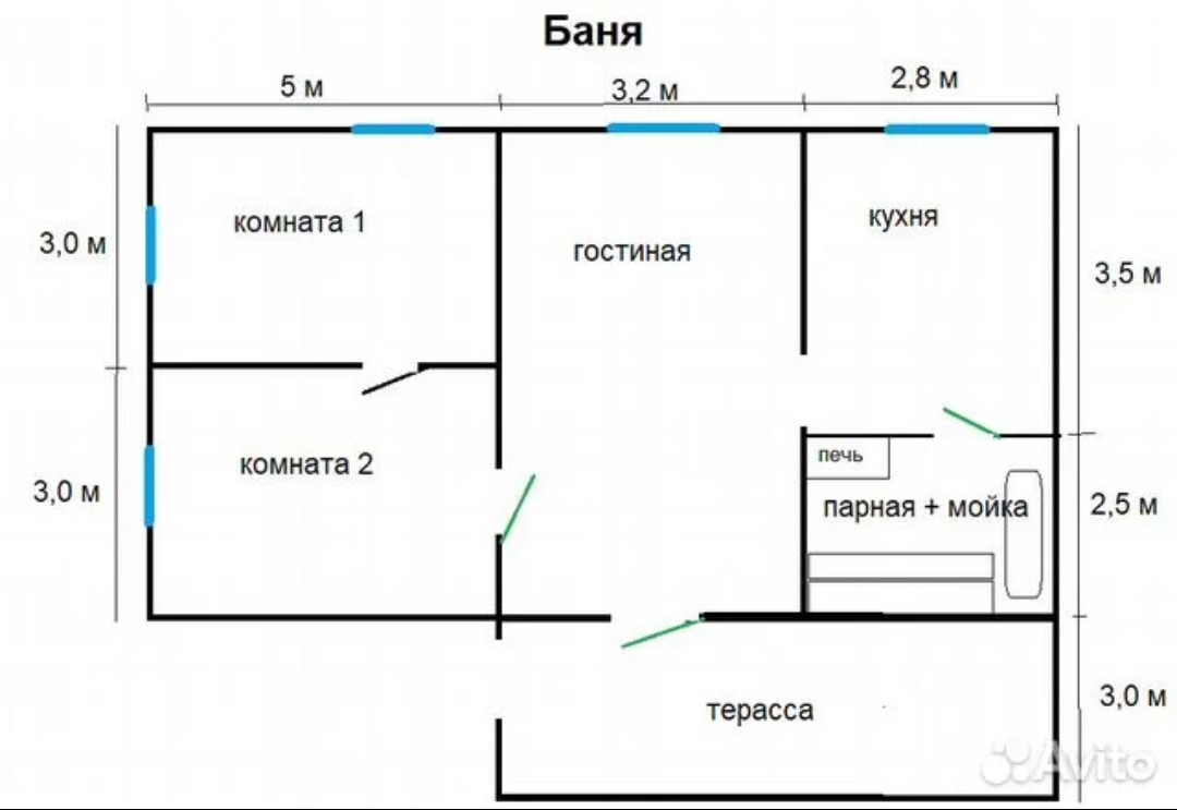 Баня: 71,1 м2, из бруса 150*180, парилка, 3 жилых комнаты, небольшая кухня, терраса, водяное отопление, централизованное холодное водоснабжение, септик под бытовые сливы, отделка в стиле прованс (обжита), дровяное отопление.