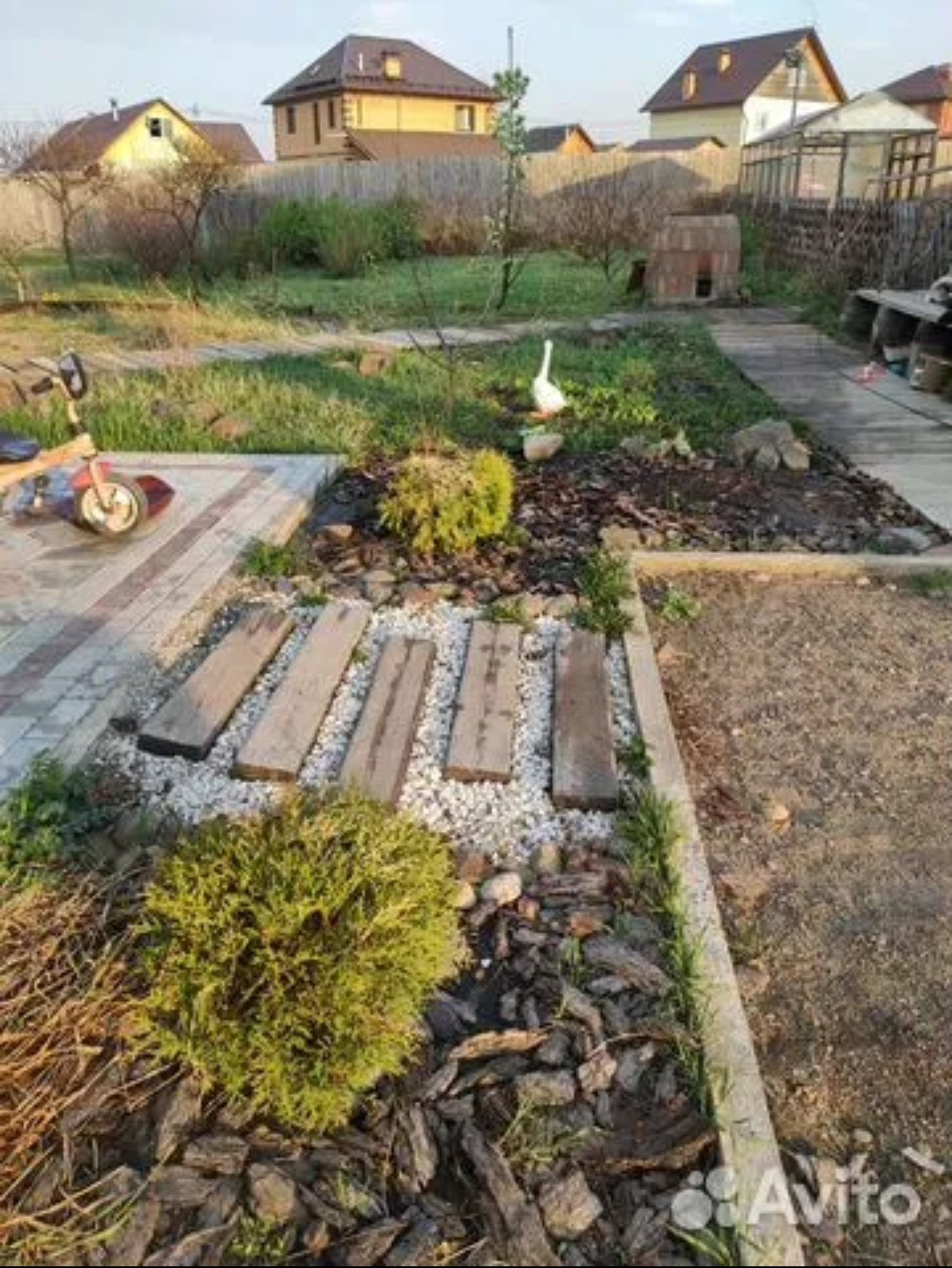 Участок: огорожен, благоустроен, имеется скважина и разводка для полива участка (кессон, винтовой насос в скважине, центробежный насос высокого давления "Гардена" для полива, фитинги), оборудован тропинками разного формата, участок разбит на 3 зоны: