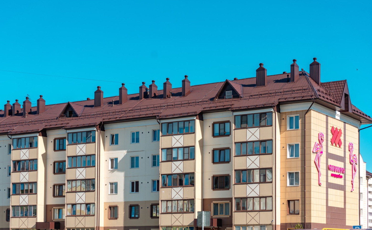 ЖК «Фламинго» — это комплексная малоэтажная застройка. Фасад дома выполнен в пастельных тонах с применением яркого цветового акцента. Установлены отечественные грузопассажирские лифты.