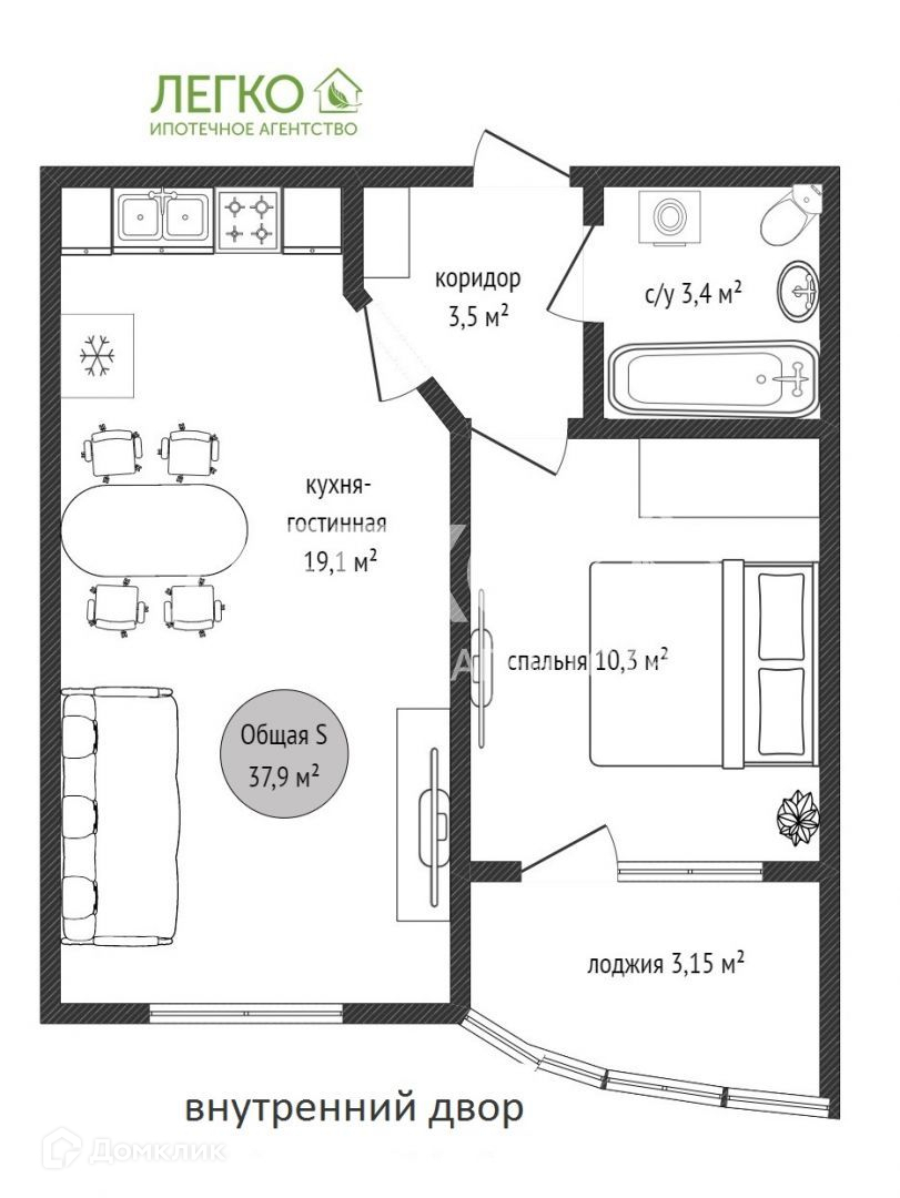 Общая площадь 38 м2