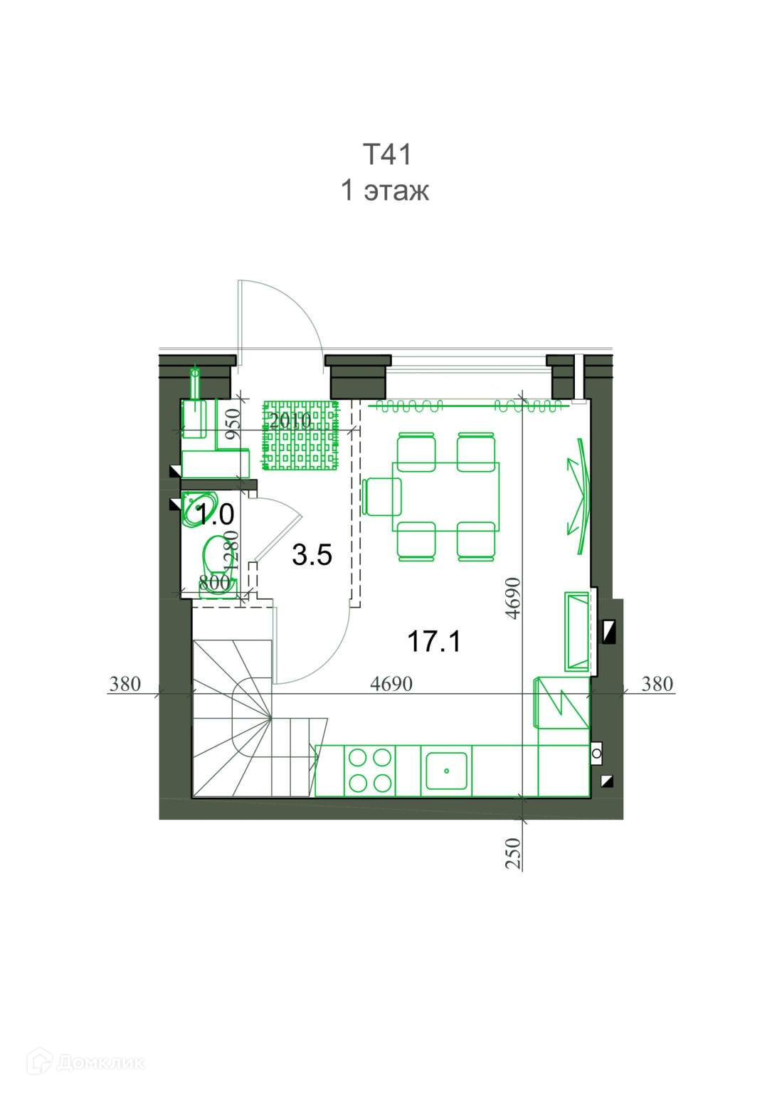 Общая площадь 41.3 м2