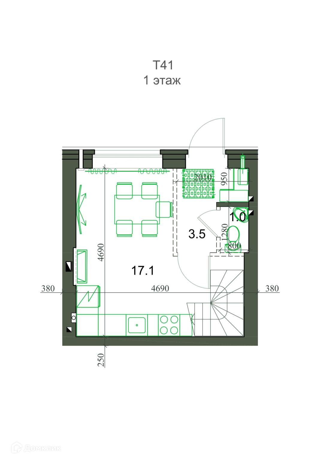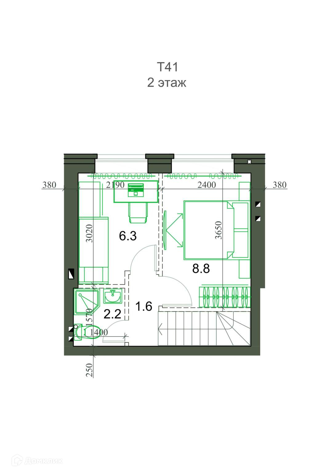 Общая площадь 41.3 м2