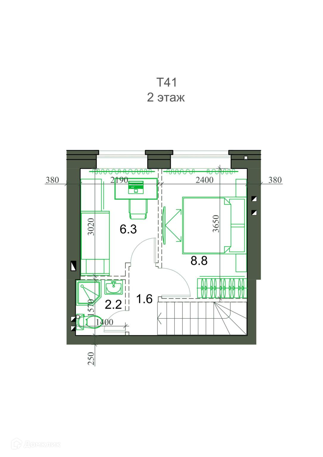 Общая площадь 41.3 м2