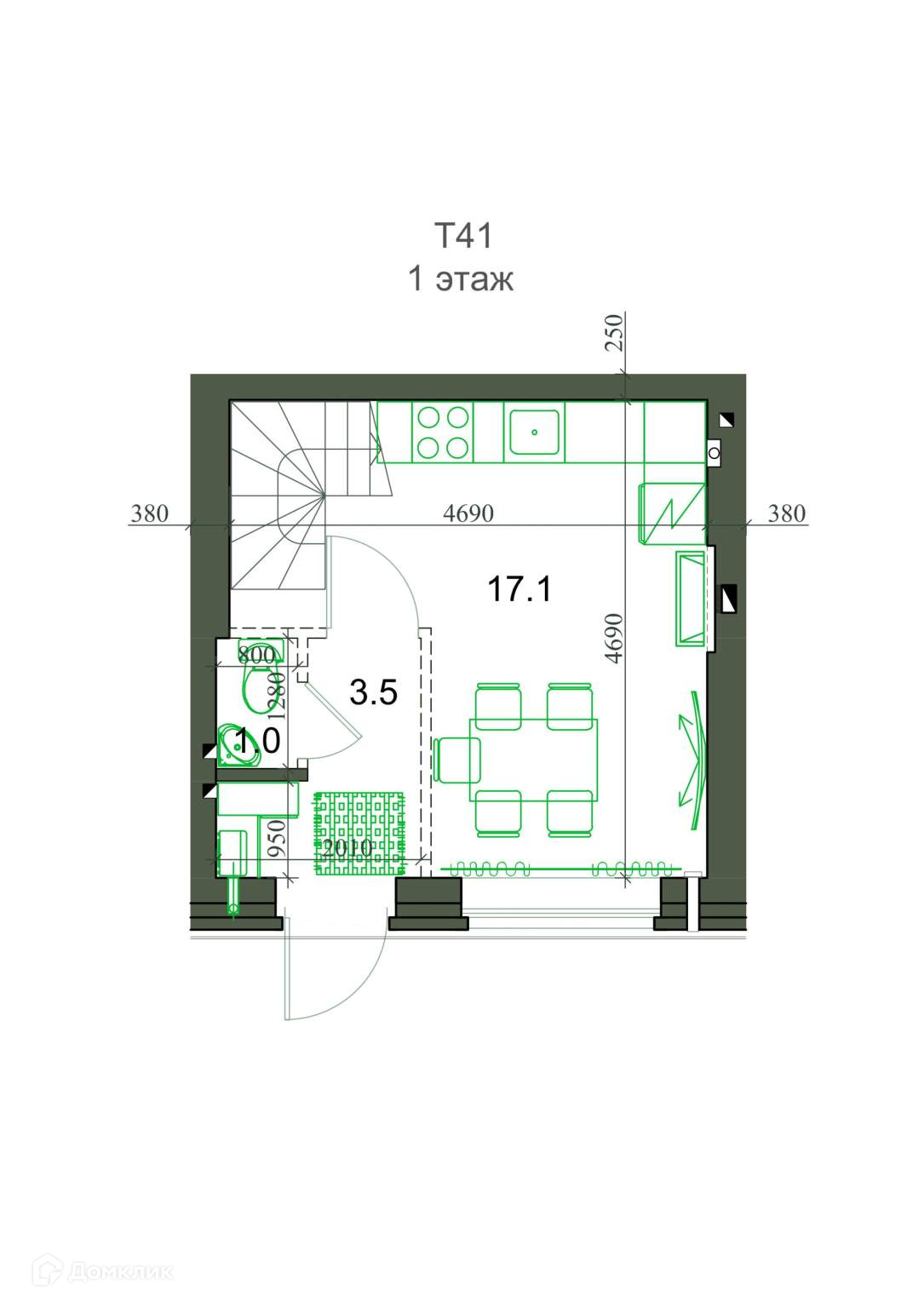 Общая площадь 41.3 м2
