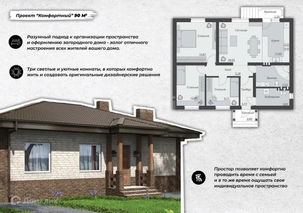 Дом 90м² на участке от 8 соток. Три спальни, просторная кухня-гостиная, вместительная ванная комната и хозяйственные помещения. Мы продумали ВСЕ!