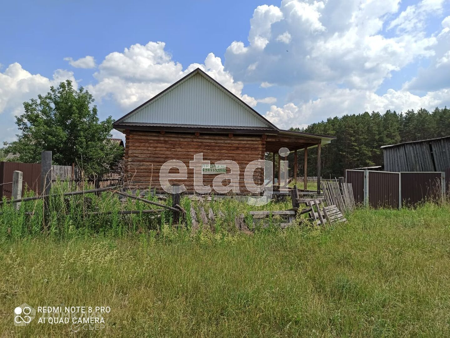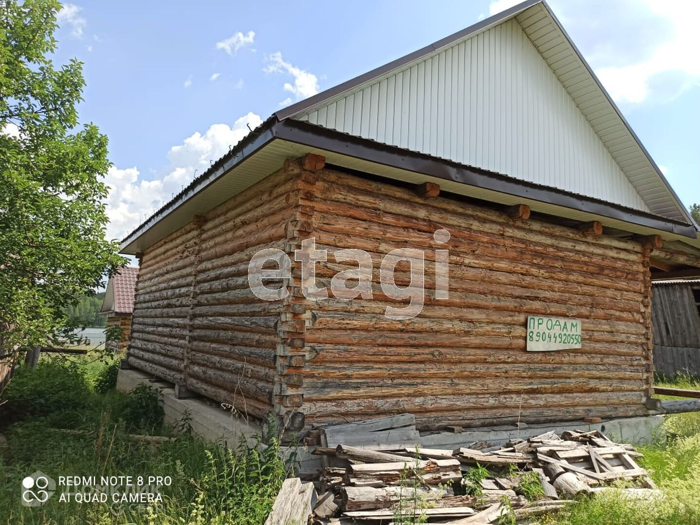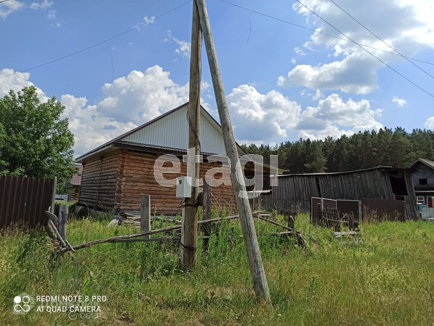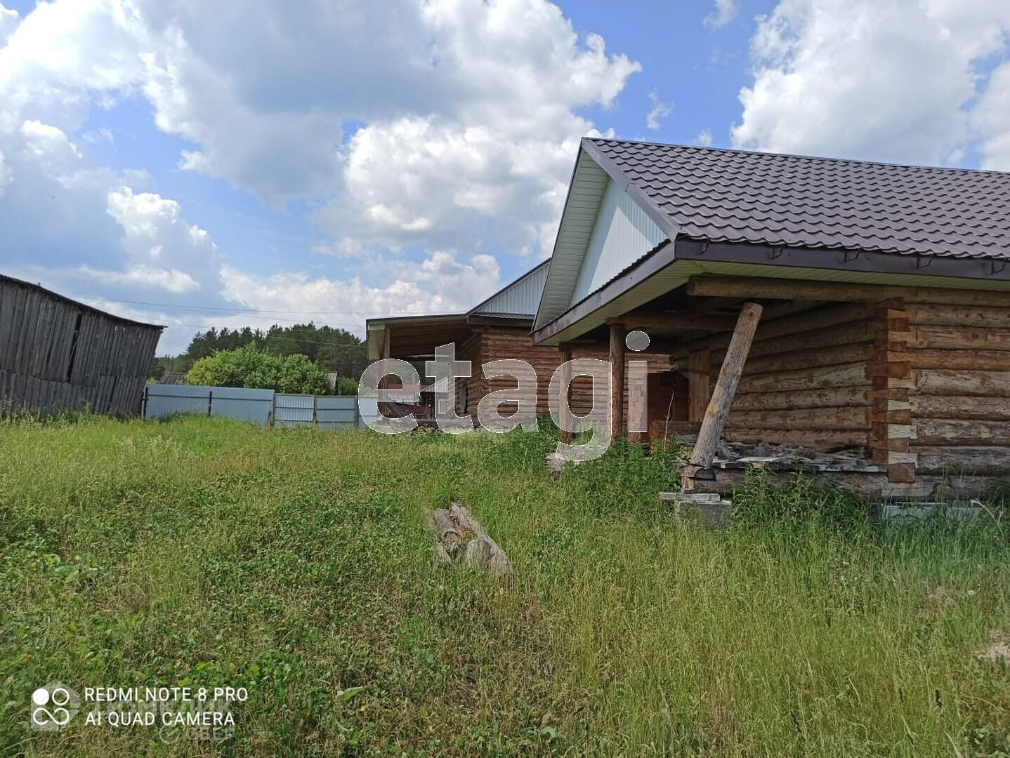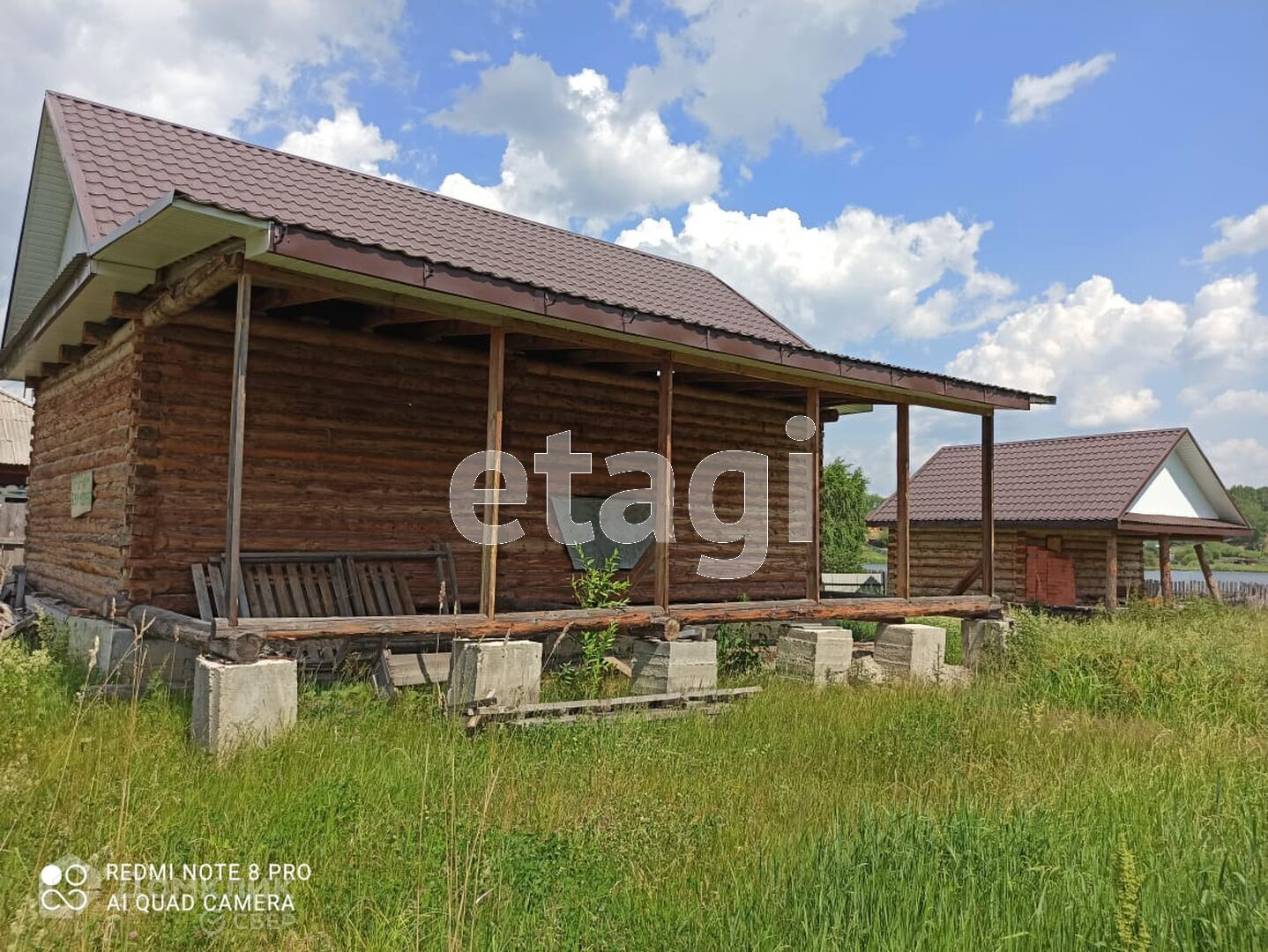 Дом построен из бревна, стоит на высоком фундаменте, покрытие крыши - металлочерепица.