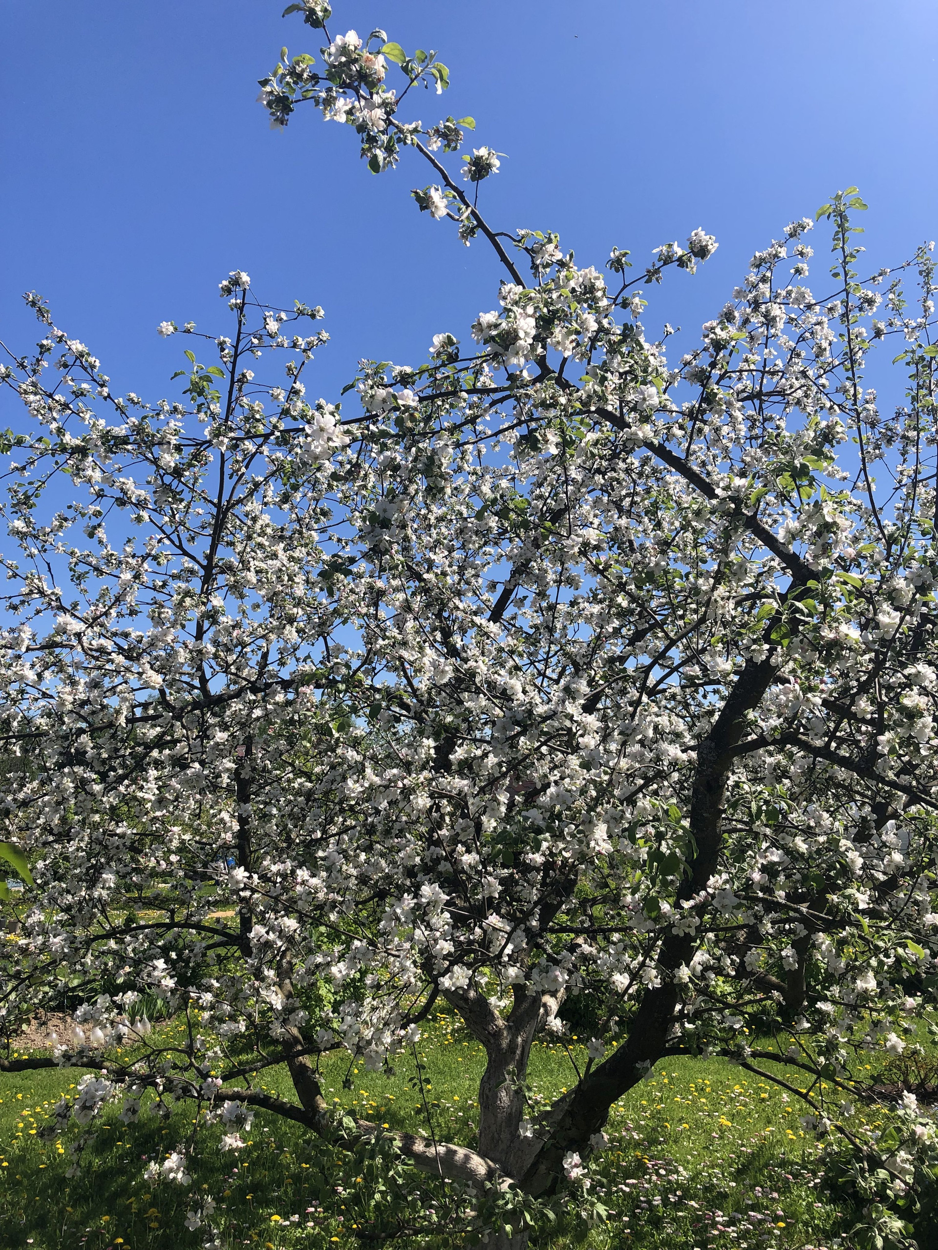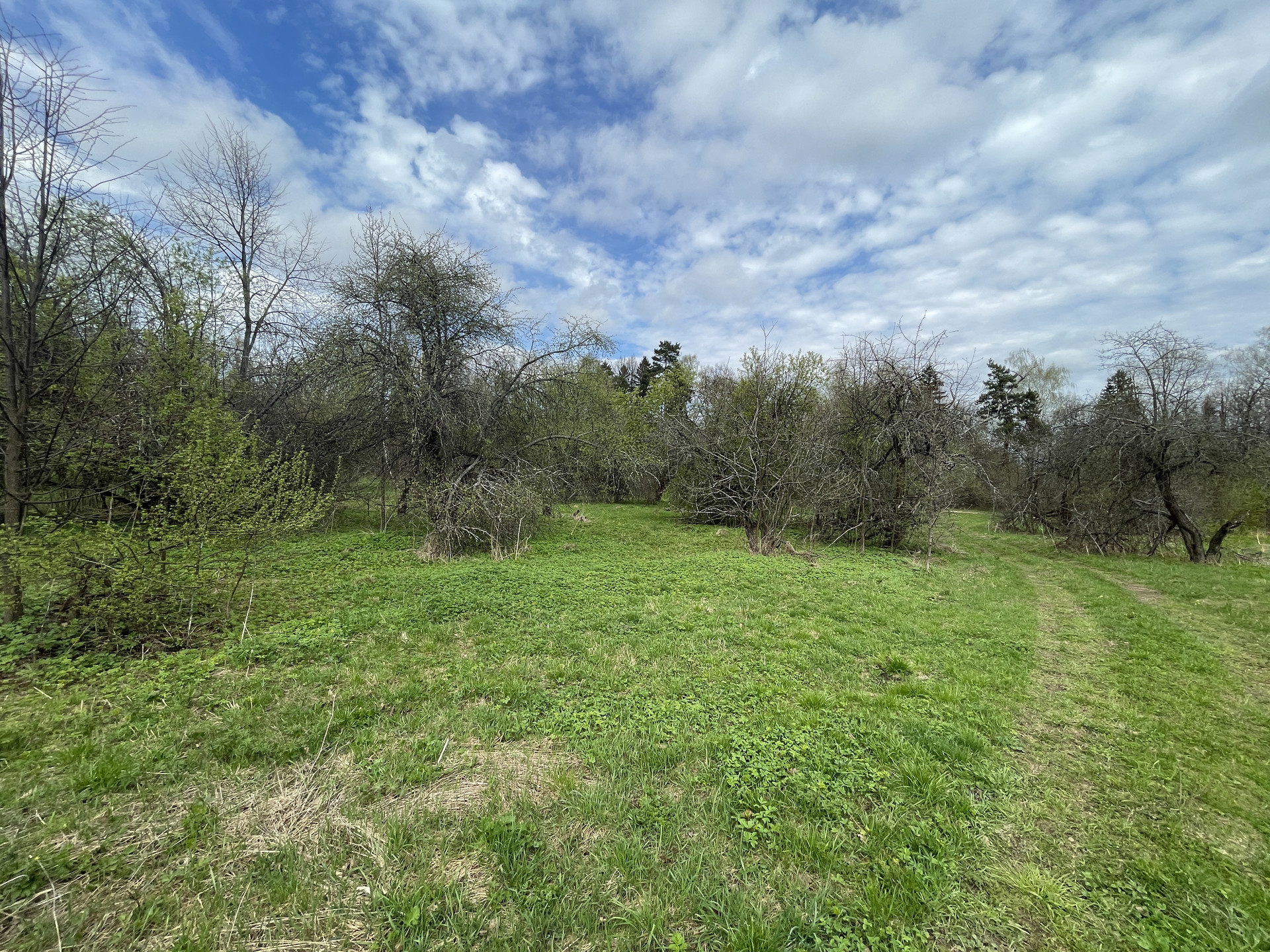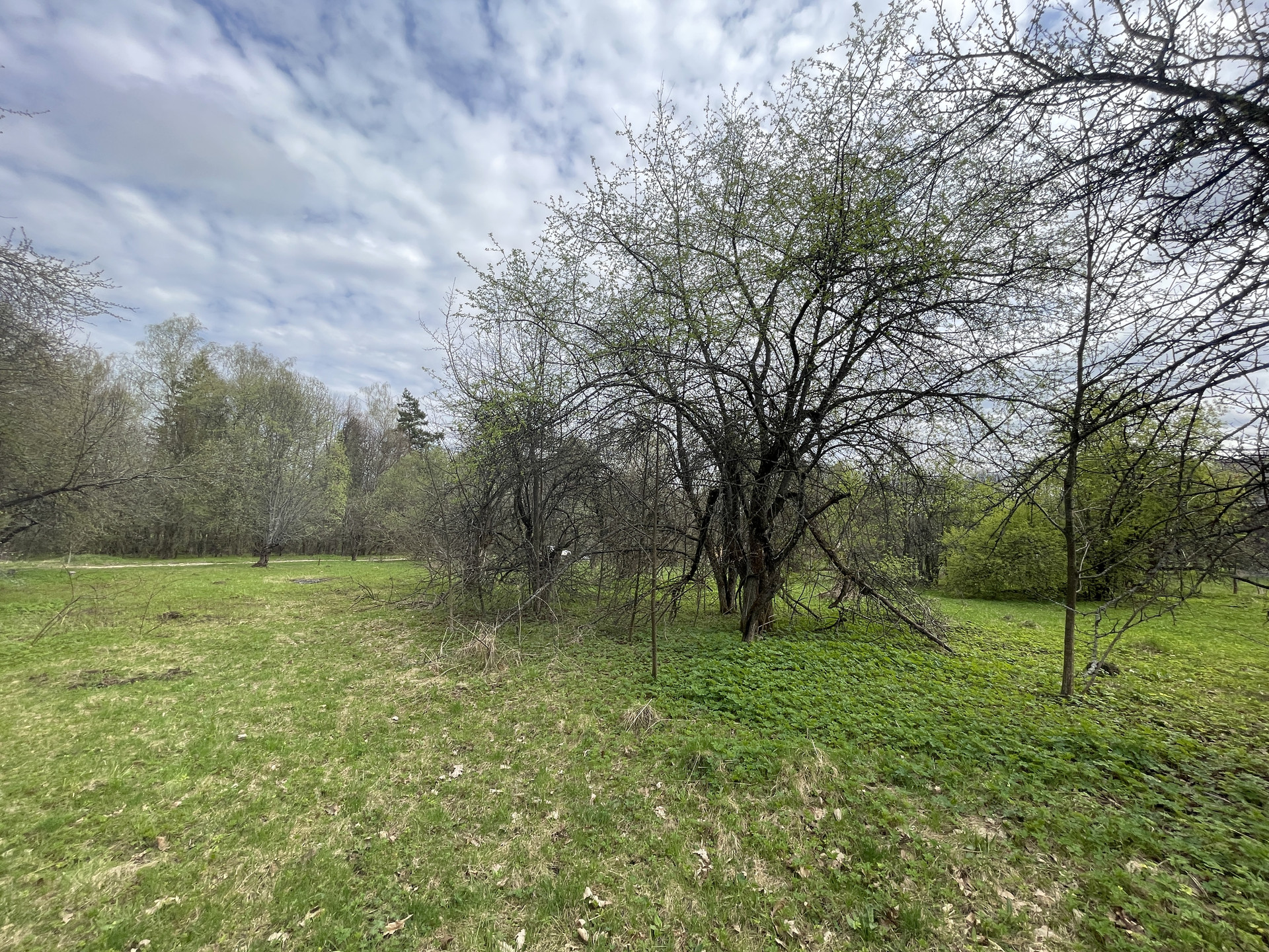 · На участке плодоносящий яблоневый сад, ровный ландшафт, черноземная полоса, дубы и липы по границе