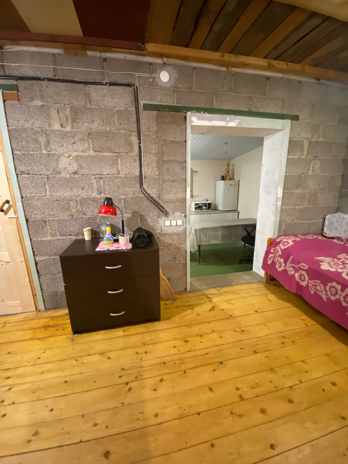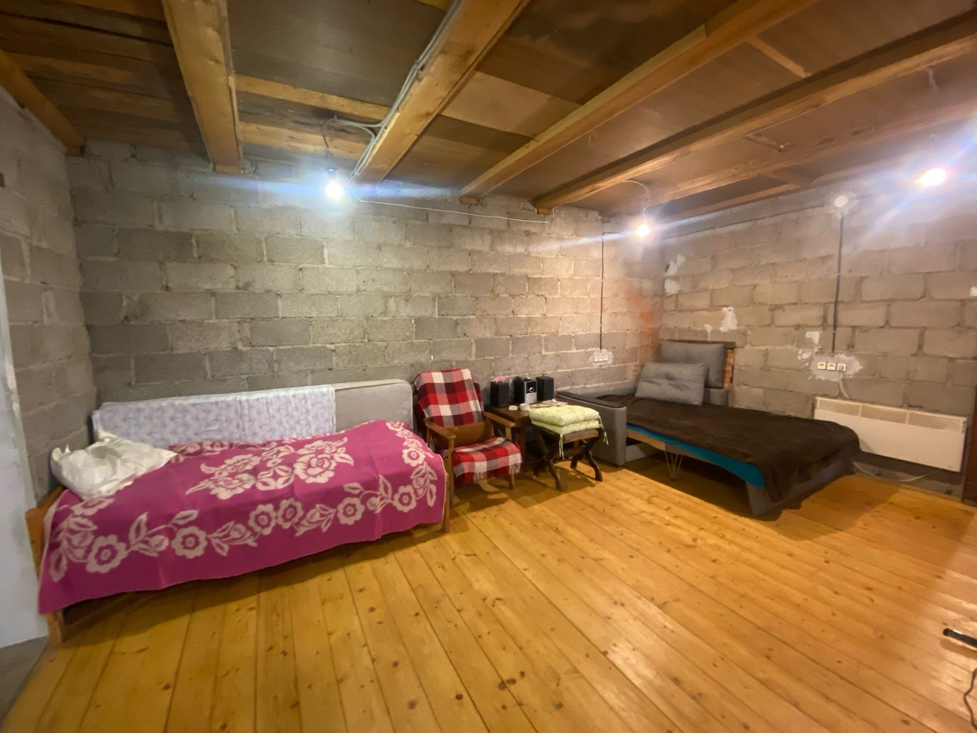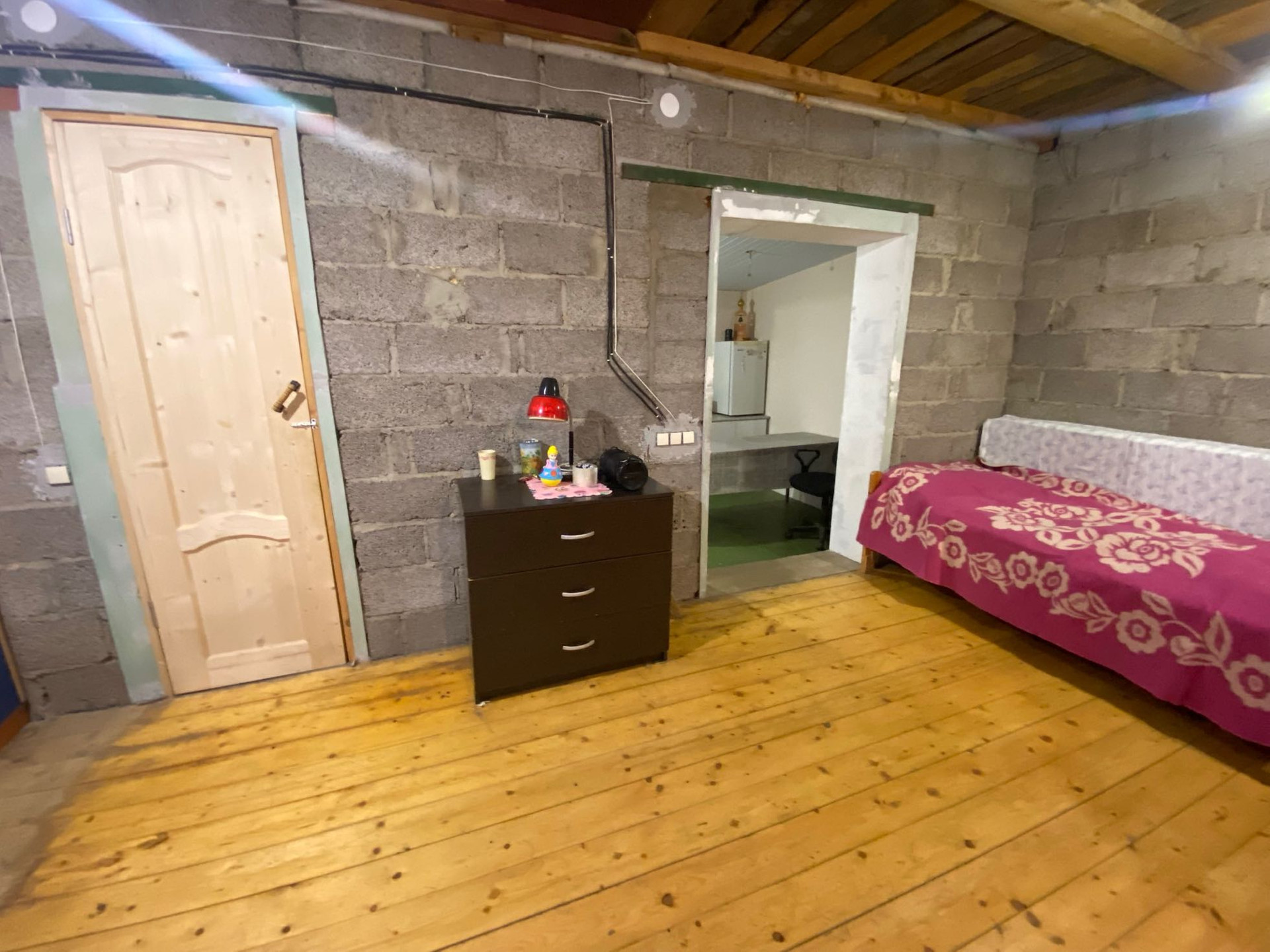 1 этаж: состоит из 1 большой комнаты , кухни-пристройки с мебелью, туалет и душевая в доме, есть вход из дома в гараж. Гаражная комната совмещена с котельной.