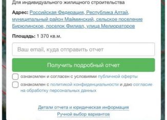 Продам участок между п. Филиал и с. Бирюля 1,4 Га или 143 сотки. Отличное место для строительства загородного отеля, с хорошей транспортной доступностью, до г. Горно-Алтайска 10 км., до аэропорта 25 км. Участки расположены рядом с дорогой ведущей в сторону пятизвездочного отеля Алтай Резорт, Каракольских озер - уникальный природный объект, где планируетс... |