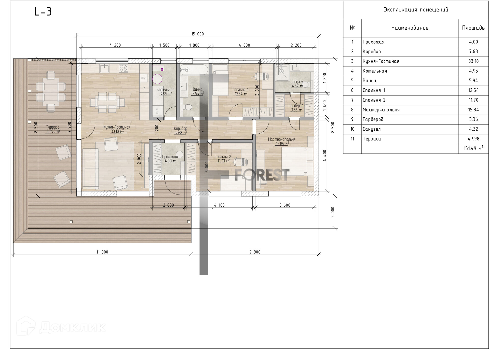 2 спальни по 11.7м2, 12.54м2 и мастер-спальня 15.84м2 с гардеробной 3.36м2 и санузлом 4,32м2кухня-гостиная с выходом на террасу 33.18м2ванная комната 5.94м2котельная-прачечная 4,95м2прихожая 4м2коридор 7,68м2терраса 47.98м2