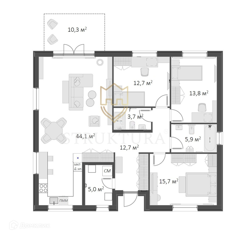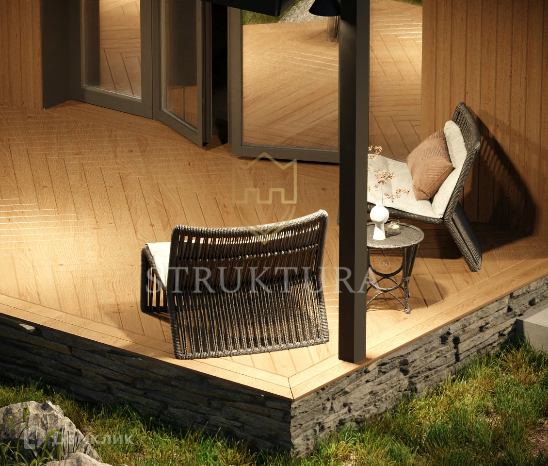 2. Планировка дома очень функциональна и включает следующие помещения: тамбур-прихожая, котельная-постирочная, коридор, 3 изолированные спальни, совмещённая гостиная с кухней 44 кв. м., 2 сан. узла, терраса 10 кв.м.