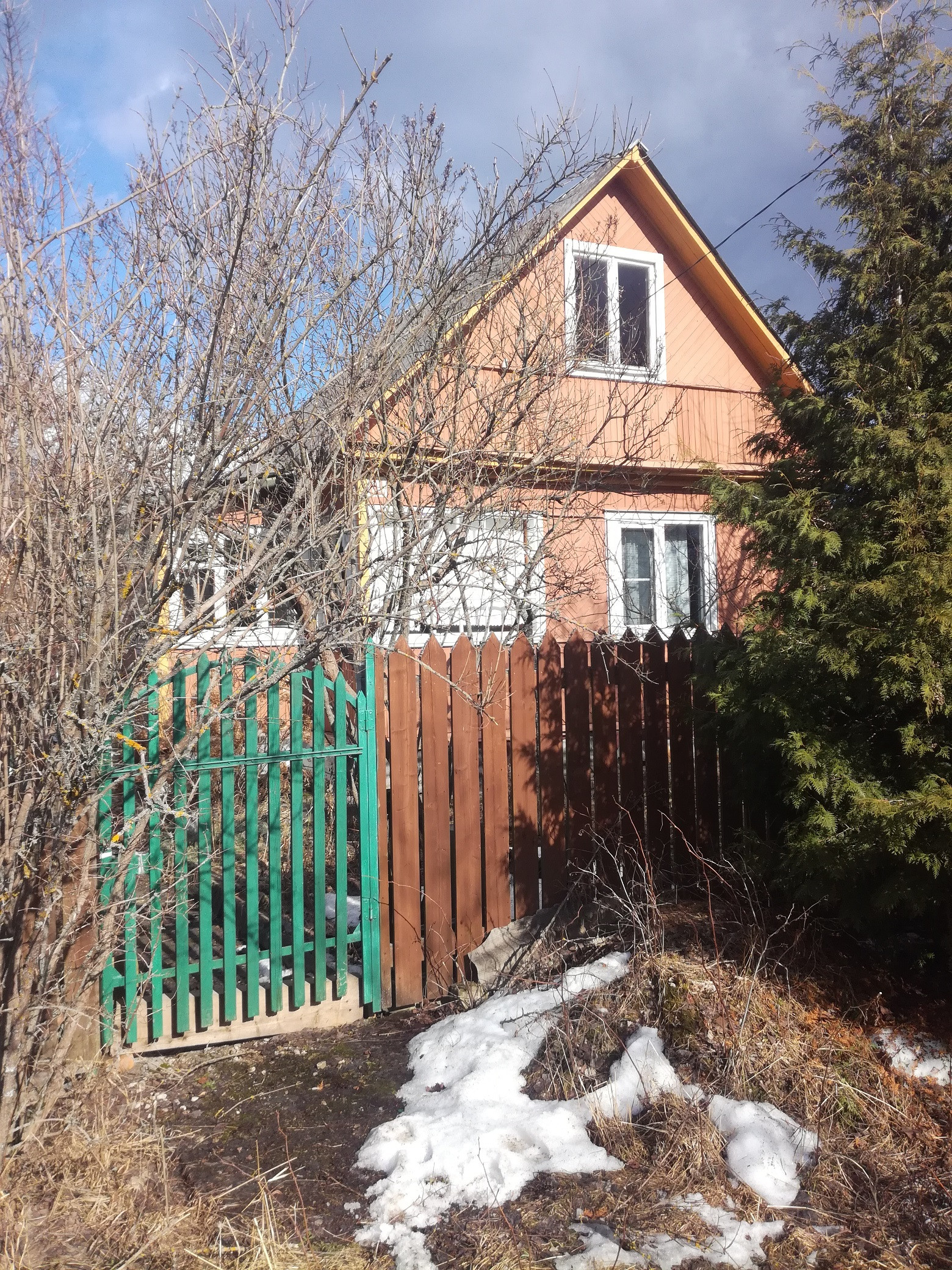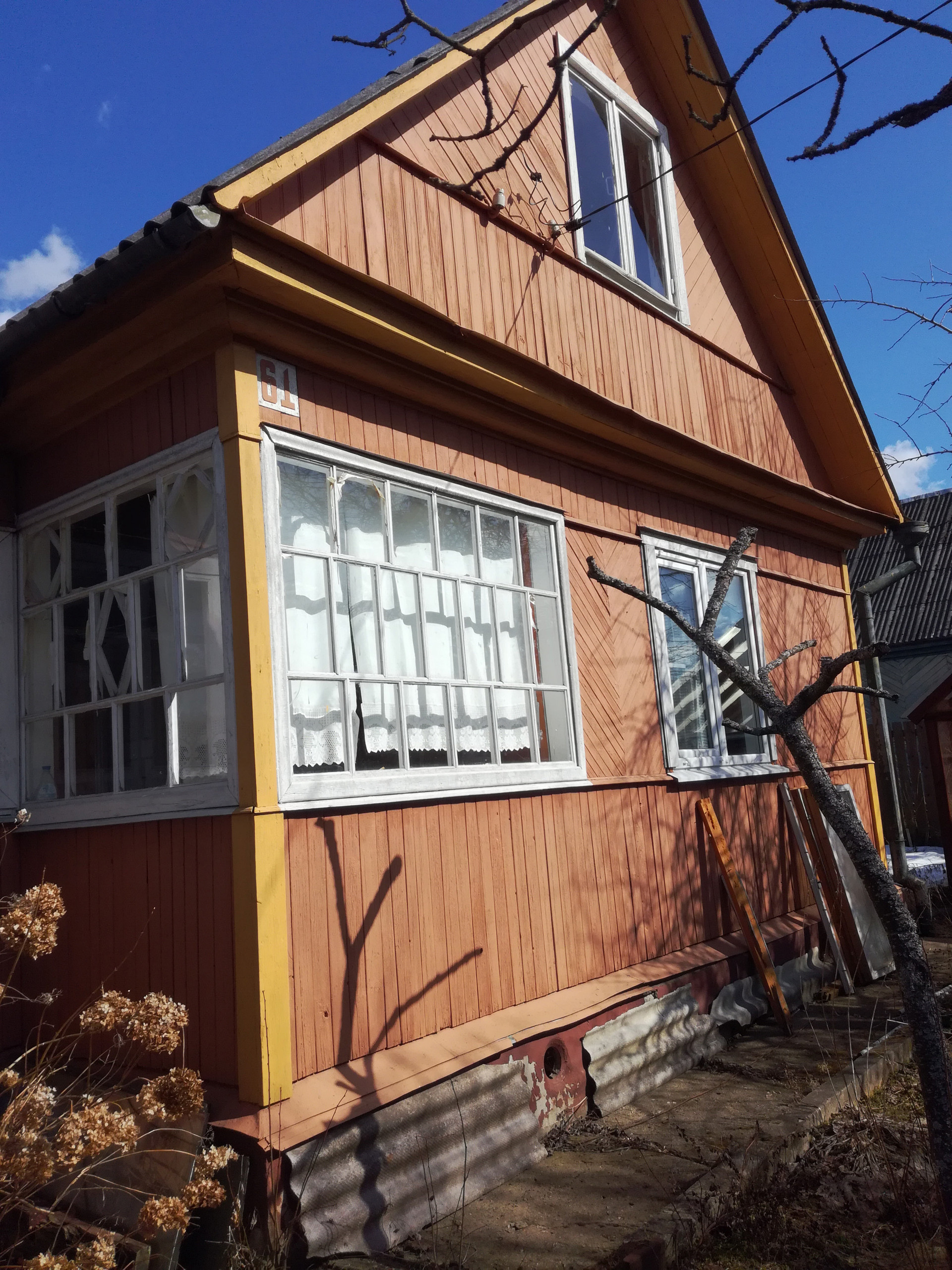 -- деревянный каркасный дом, с утеплителем (засыпка в междустенье), обшитый доской, площадью 54 кв.м. (2 этажа, 4 спальни), окна первого этажа с новыми стеклопакетами. (Электричество в доме в наличии).